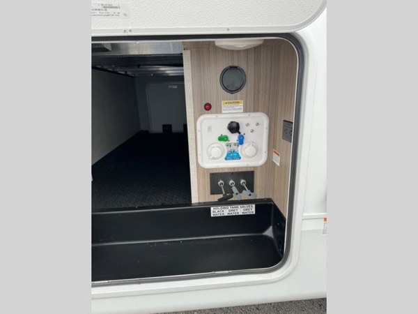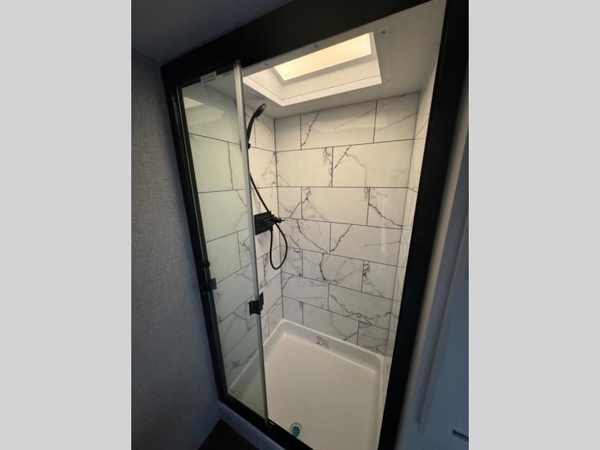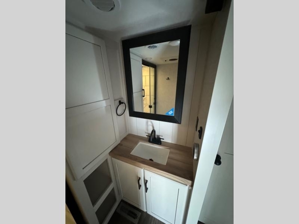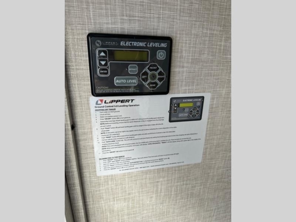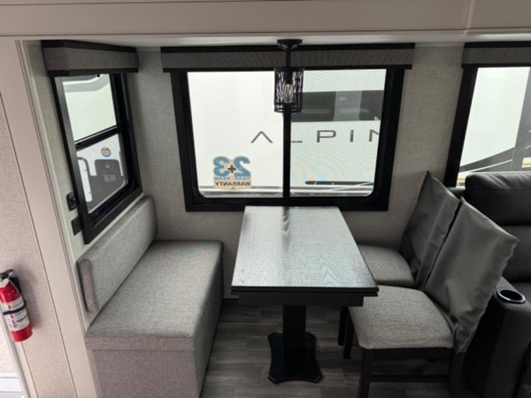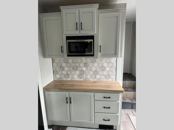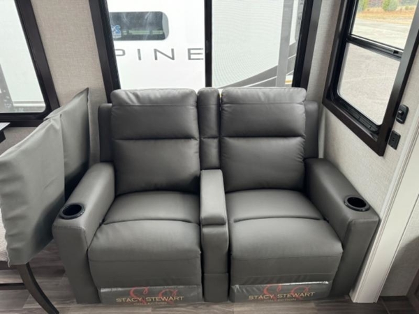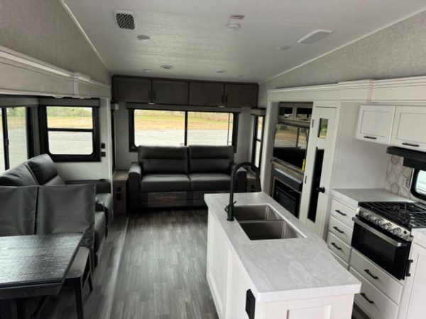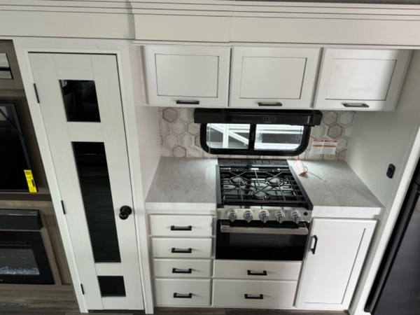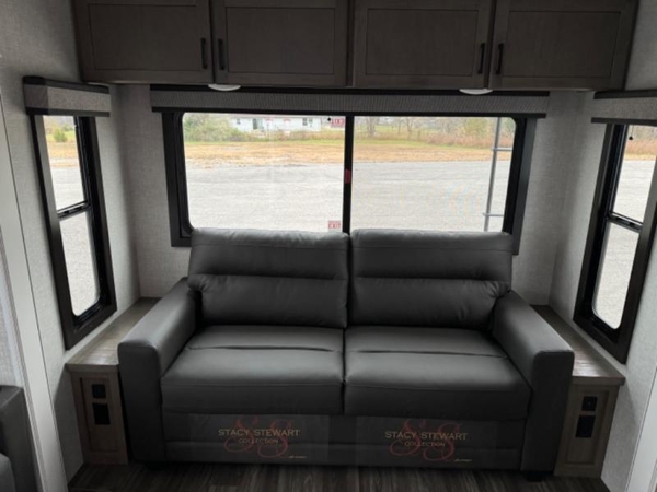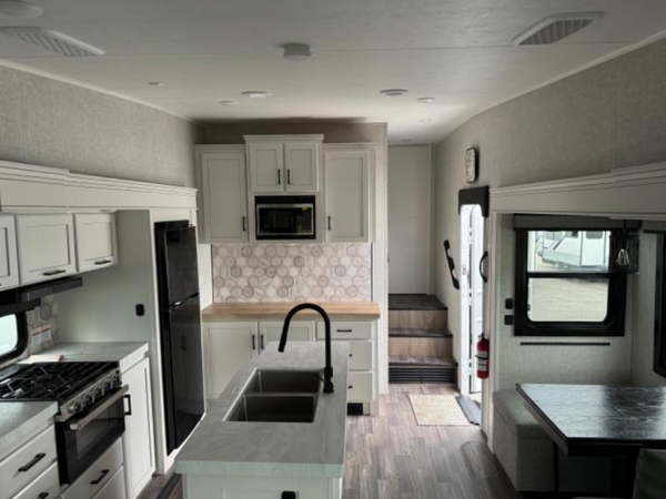 You will love how much interior space you have in this fifth wheel thanks to the dual opposing slides in the kitchen/living area! While your crew is relaxing on the theater seat or tri-fold sofa, you can prepare dinner on the 17" range with edge to edge grates. There is also an entertainment center and fireplace across from the theater seat for easy viewing, and the table and chairs with a bench will be the perfect place to play a board game at. Head to the front to enjoy the private bedroom with a queen bed, and the full bath is close by for easy nighttime use!