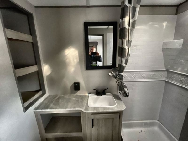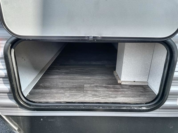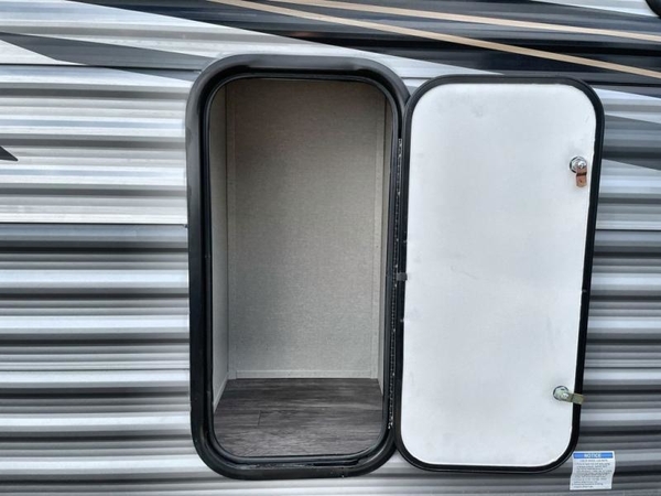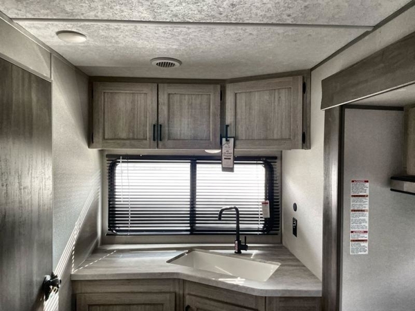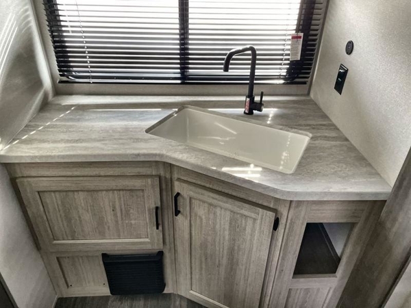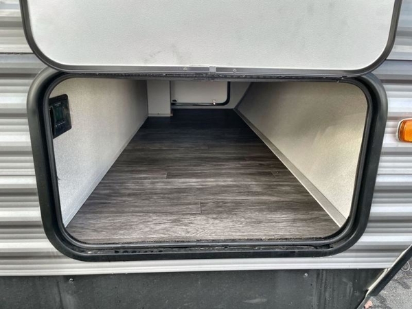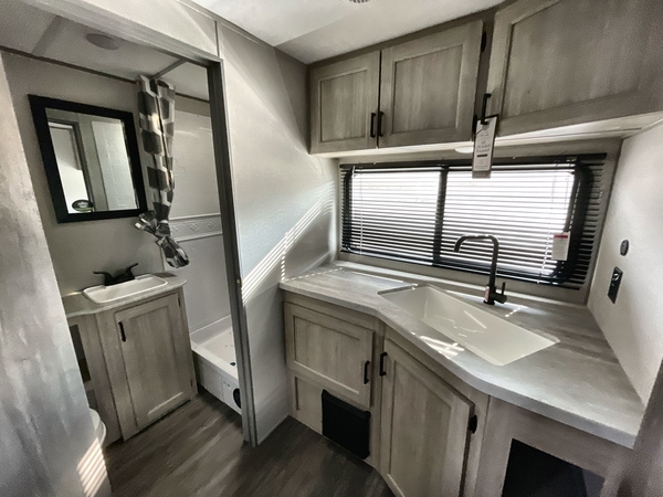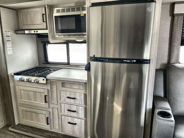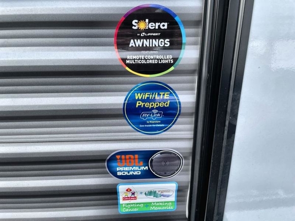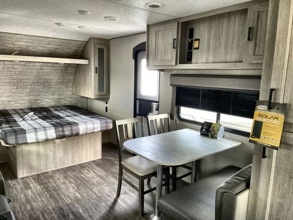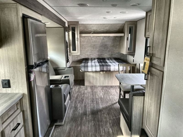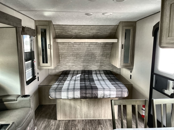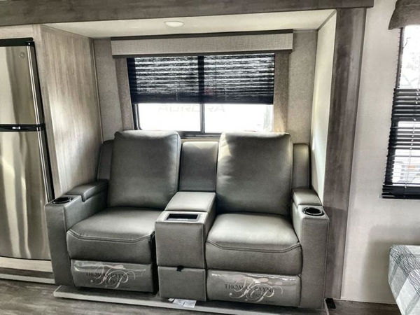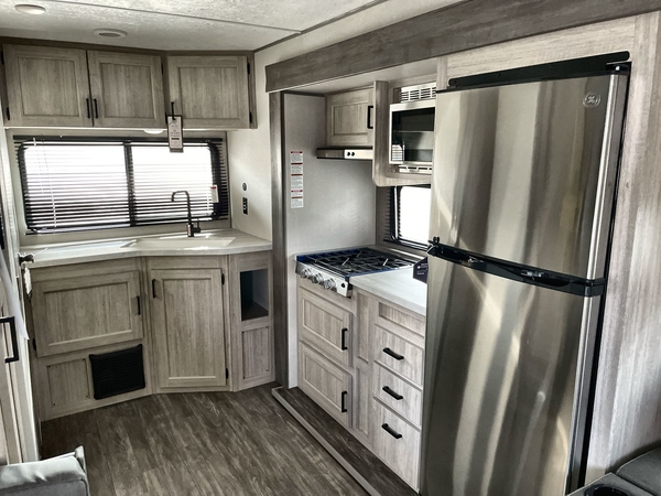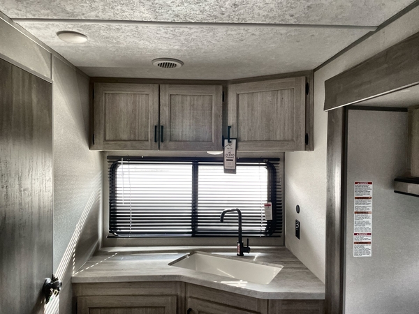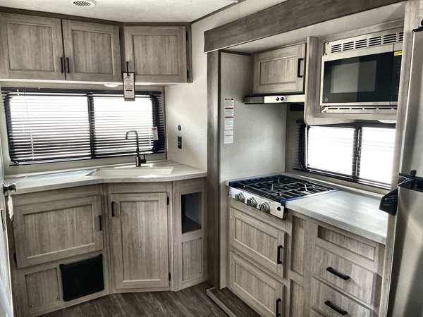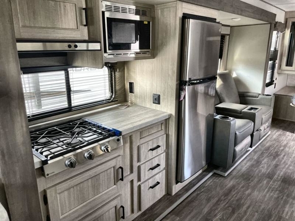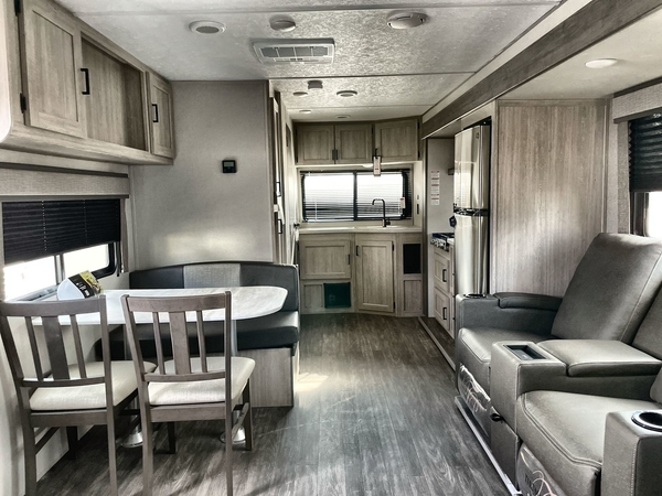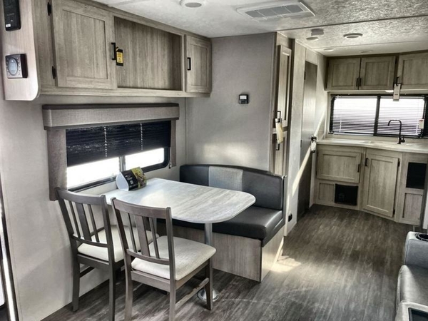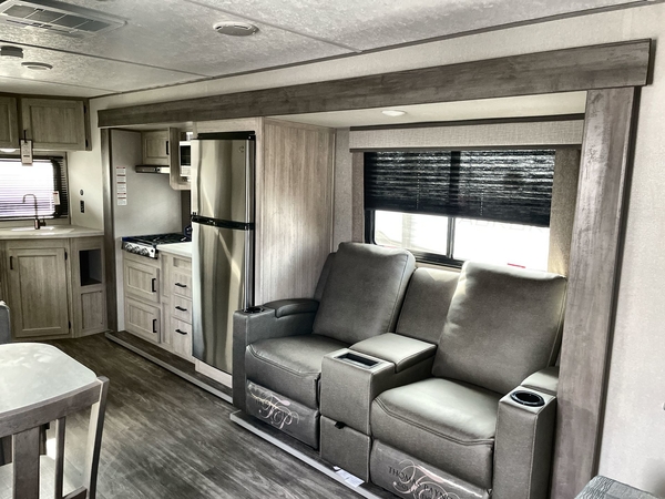 The chef will love cooking in the rear corner kitchen of this travel trailer! You will feel right at home in the front private bedroom with a 60" x 74" RV queen bed with dual bedside wardrobes and an overhead shelf for your personal items. There is a dinette with one bench seat and two chairs just to the left of the entry door for dining, and there is a TV mount above plus overhead cabinets for storage. Opposite, a slide out featuring a 68" theater seat, plus the kitchen appliances. Stay clean and fresh with the rear corner bath including a 36" x 30" shower featuring a skylight above for natural lighting as you get ready each morning. The 18' electric awning has multicolor lights for you to choose your favorite color as you enjoy an evening outside beneath it with family and friends. A nice pass-through storage compartment will hold your camp chairs and outdoor games, plus more.
