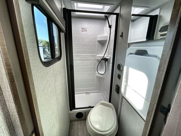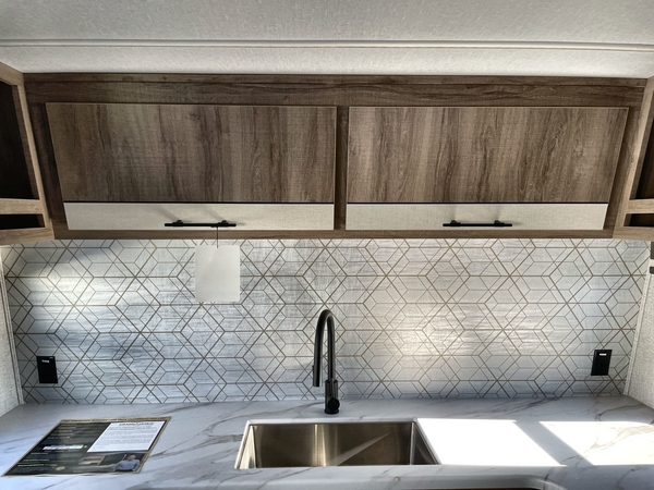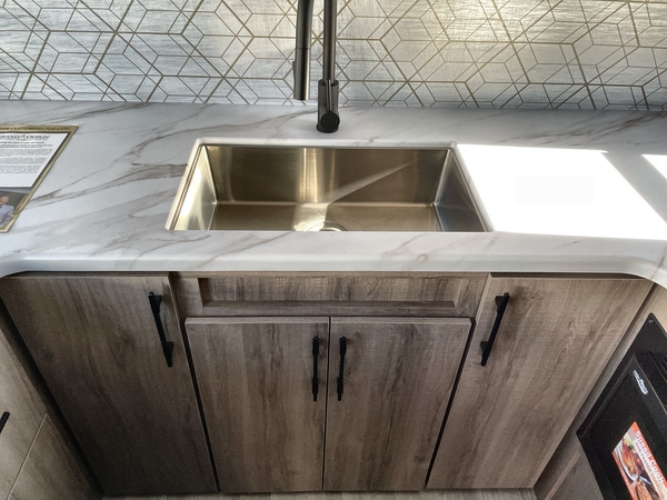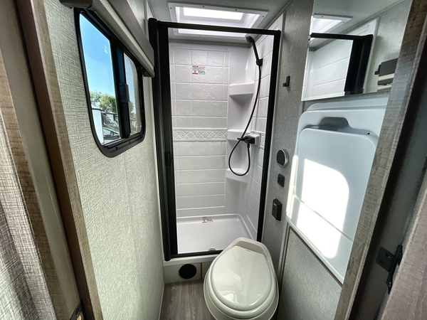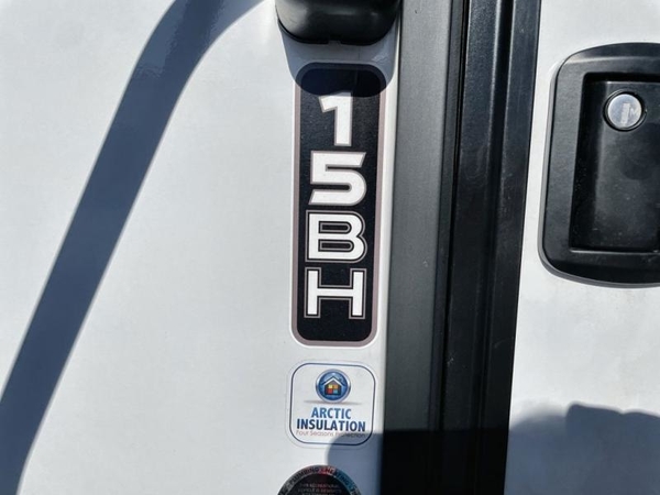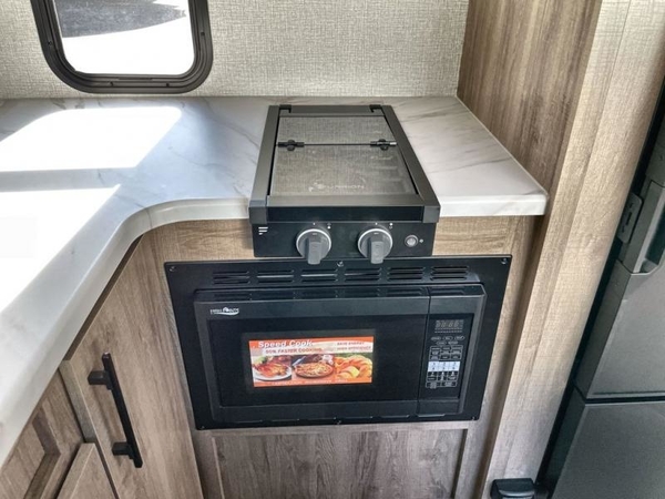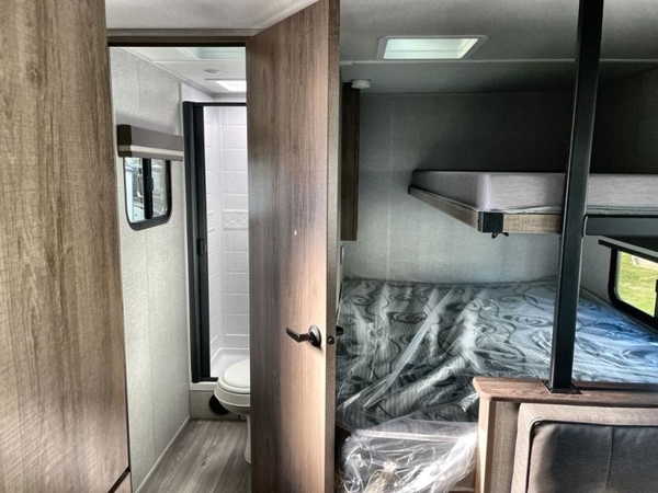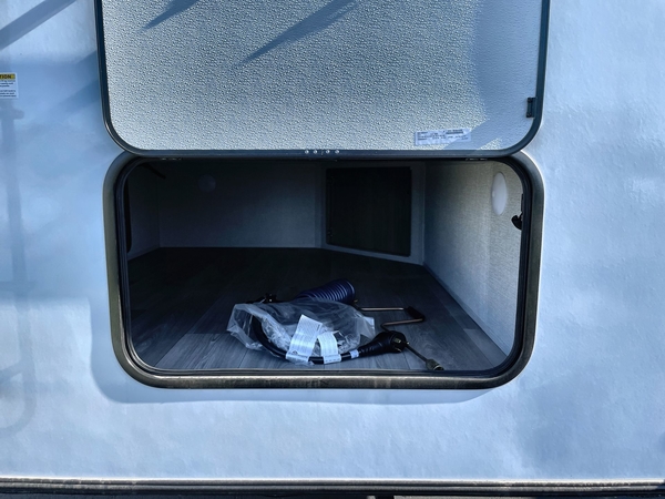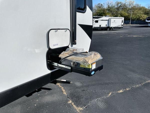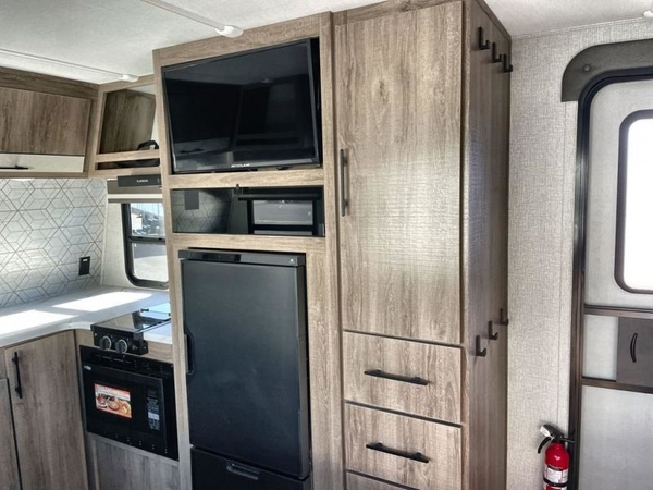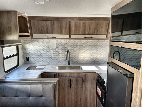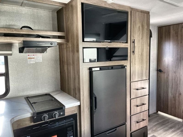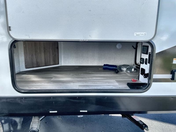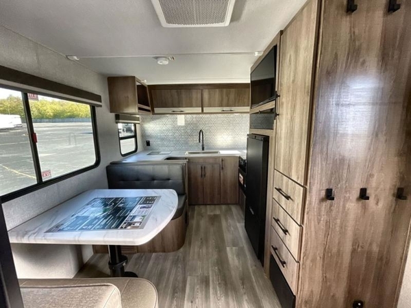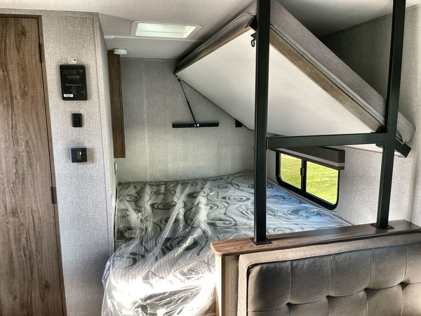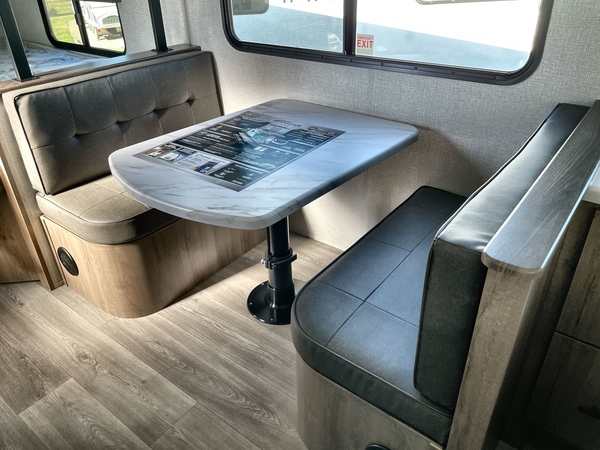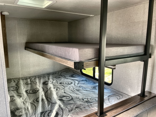 Your small family will have a fun time camping in this travel trailer! There is a queen bed below a 40" x 80" flip top bunk above it for comfortable sleeping spaces. You could even transform the booth dinette into an extra sleeping space when you aren't using it to enjoy a meal prepared with the front kitchen. You could even grill up some burgers on the outside griddle. Underneath the queen bed is a storage portal and the exterior has baggage doors to keep all of your gear out of the way!