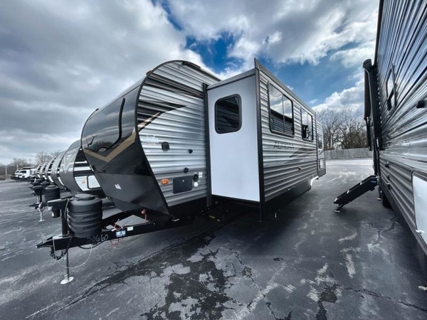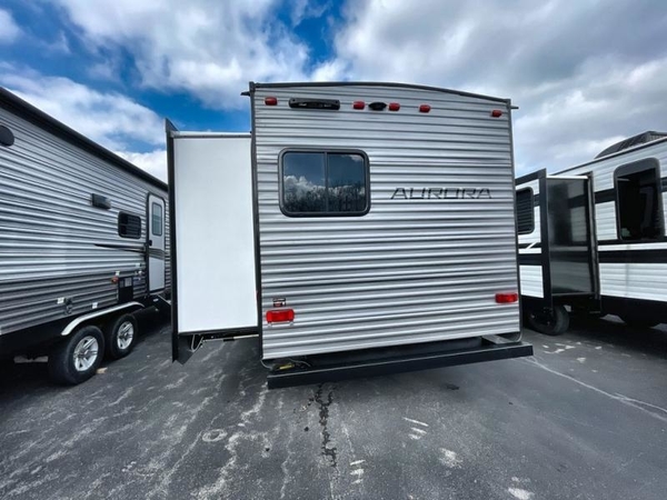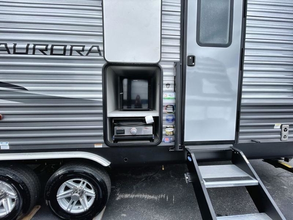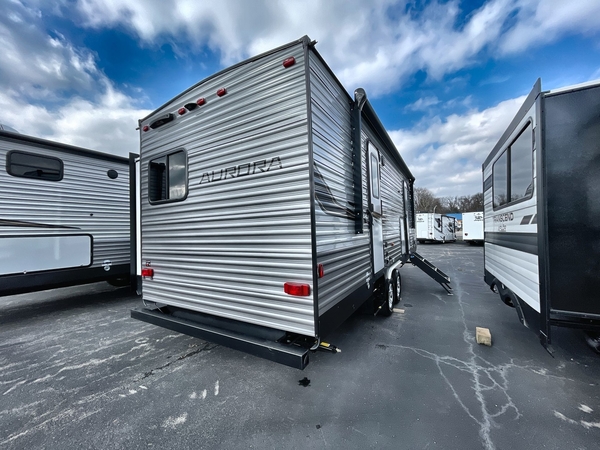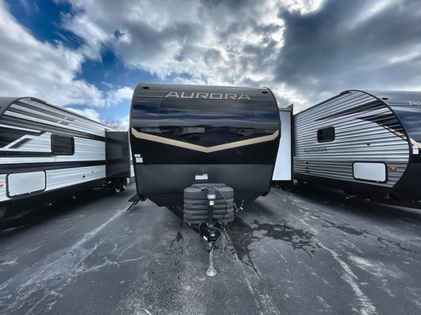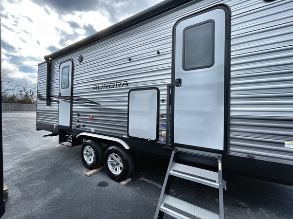 Comfortability, usability, and quality is what you will find in each one of these Forest River Aurora travel trailers, toy haulers or destination trailers! They are designed with a superior build and packed full with industry leading, functional, and distinctive standard features. SolidStep entrance steps and a Safe-T rail door assist on main entry door to help you safely enter and exit the unit. The diamond plate rock guard will protect your unit from road debris and the nitrogen filled radial tires, which keep their pressure longer, offer better fuel economy. You will also find upgraded JBL Elite exterior speakers outside, an electric awning with multicolor lights and remote, plus flush mount baggage doors for easy packing. The interiors are beautifully designed with a deep undermount farm style sink, stainless steel appliances, and linoleum flooring throughout which will be easy to clean. Come find your favorite model today!