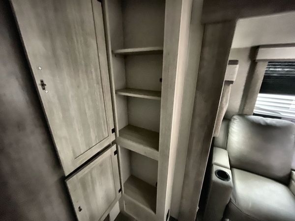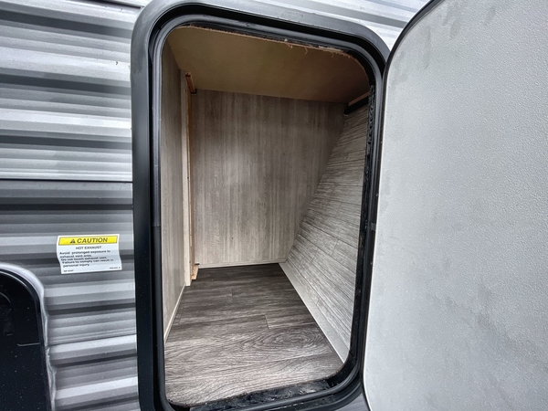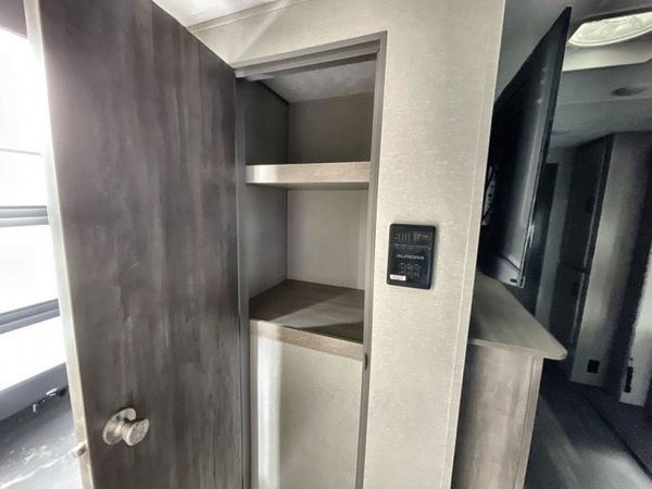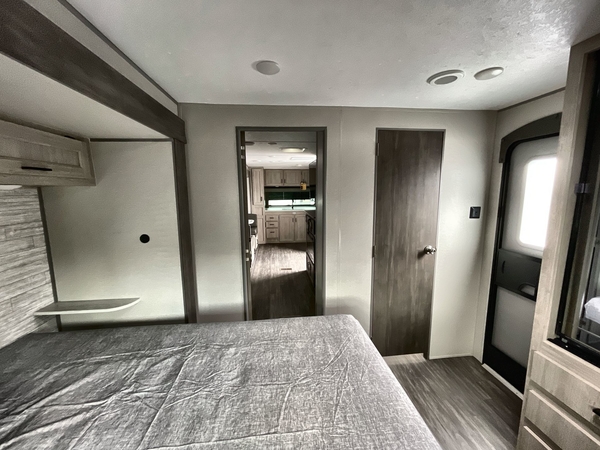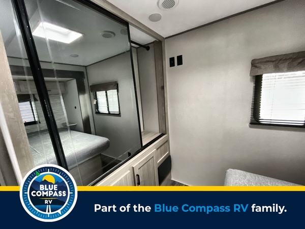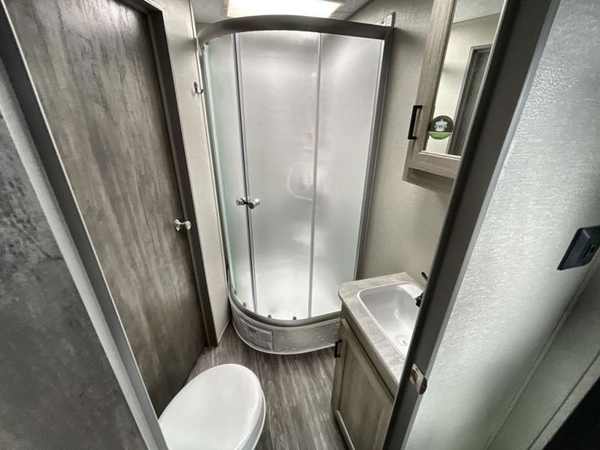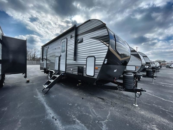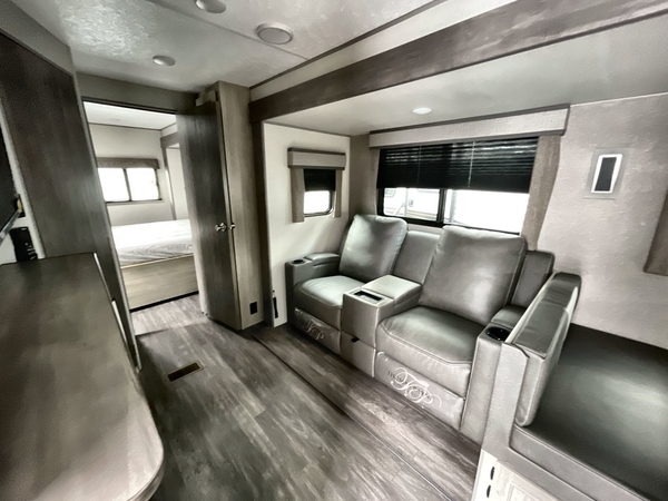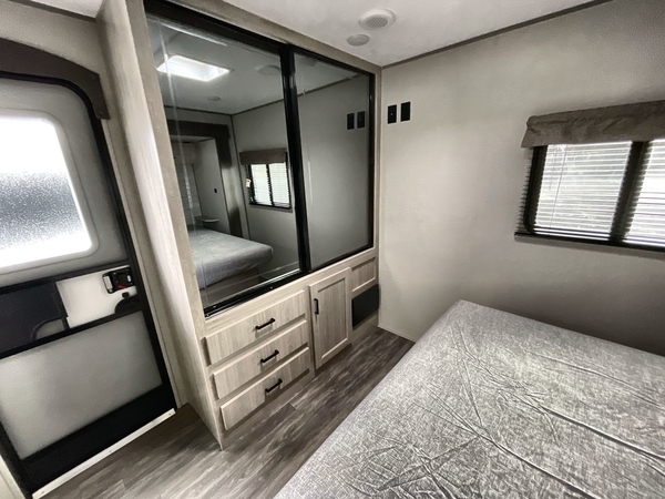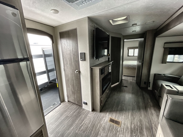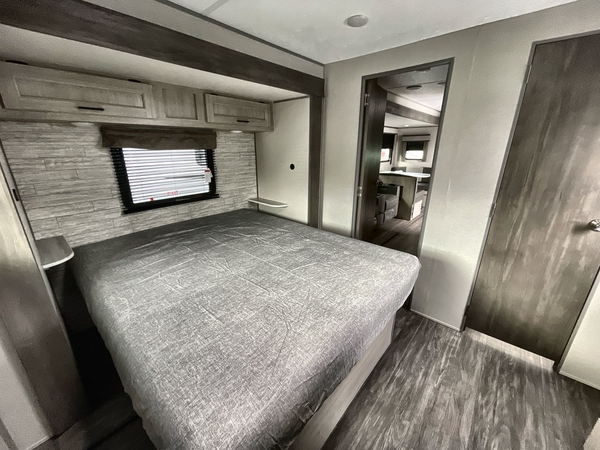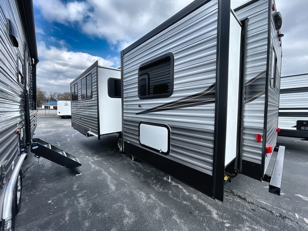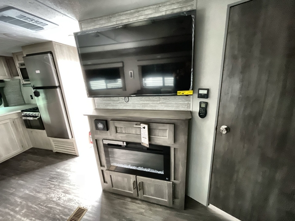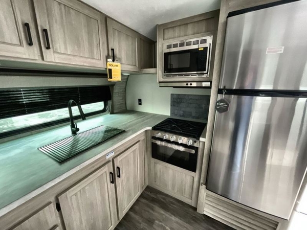 You're going to love every minute spent in this travel trailer with double slide outs and double entry doors. The front kitchen includes ample counter space to prep and cook meals, plus there are two pantries for storage space. Your crew can get comfortable on the 68" sofa or play a game at the 45" booth dinette. There is also an entertainment center with a LED TV for movie night, or you might head outdoors to relax under the 18' awning. The exterior camper kitchen here includes a griddle and a mini refrigerator the chef of your group is sure to love. When it's time to call it a night, head to the rear master bedroom that includes a 60" x 74" queen bed slide out, a large wardrobe, plus your own entrance into the dual entry bath!