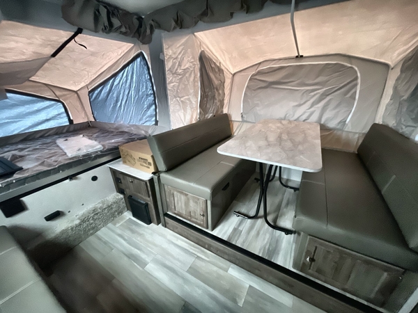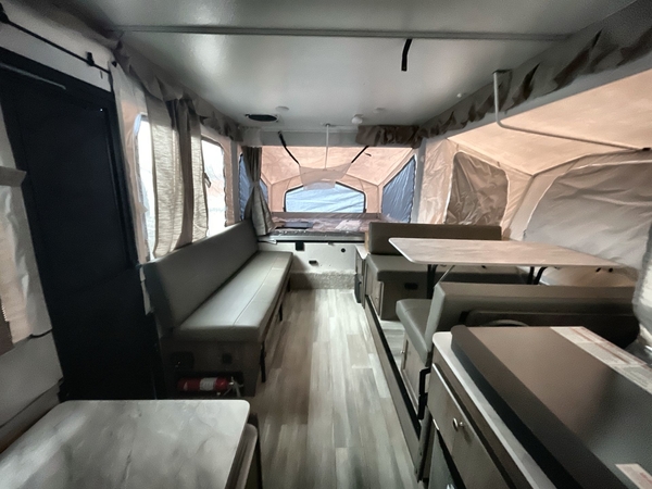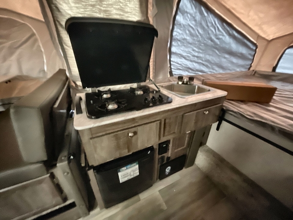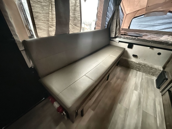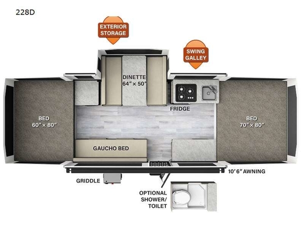 You are going to love that there is extra interior living space in this Flagstaff MAC Series folding pop-up camper when you push out the single slide! The slide holds the booth dinette which can be used for dining or sleeping, and you also have another lounge spot with the gaucho/bed right across from the dinette. The interior cabinets provide you with storage space for your travels, and there is even an additional exterior storage compartment for more gear. To make this camper even more accommodating, you can choose to add the optional shower/toilet.