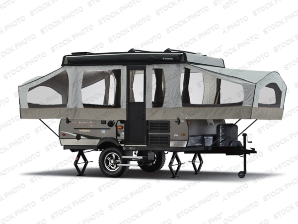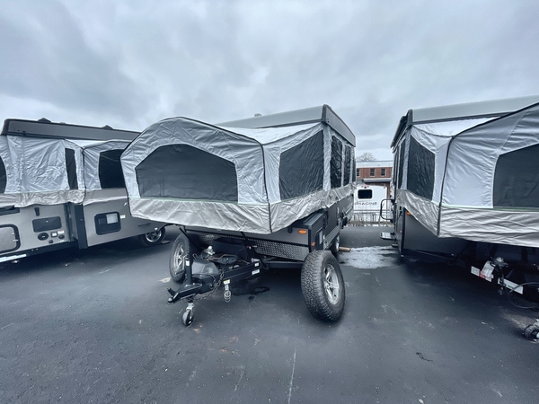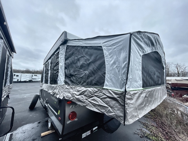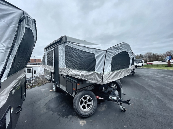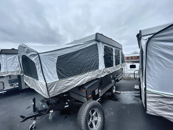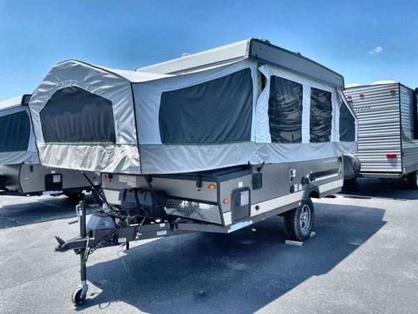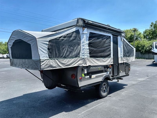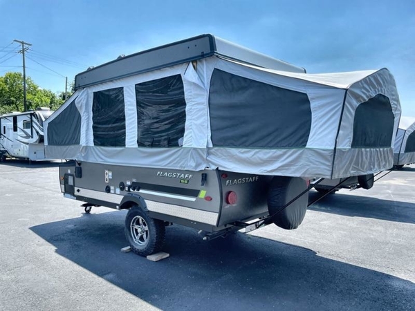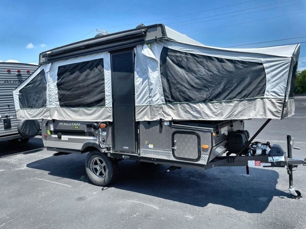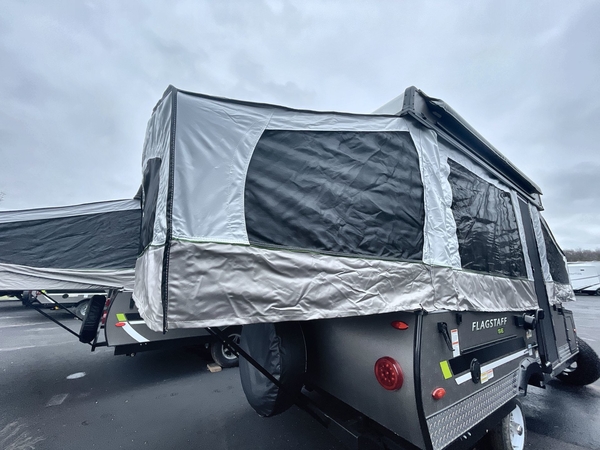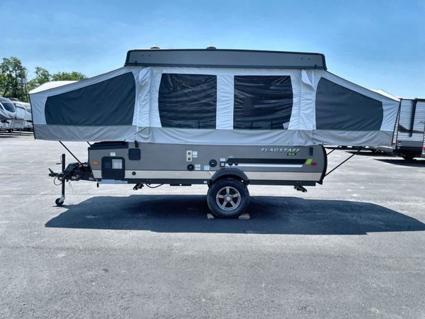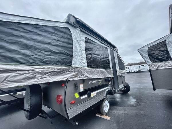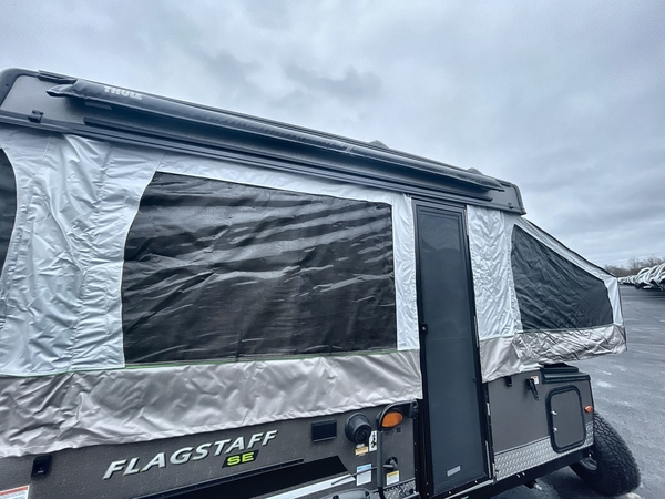 If outdoor sports are the reason you want to get away, then the Forest River Flagstaff SE folding pop-up camper is precisely what you need! These Sports Enthusiast Package (SE) campers have proven that they are sports-friendly and camping-approved. Built with a gray sport exterior, autumn wood interior, and wood plank flooring, the Flagstaff SE is ready for all sorts of outdoor experiences. There are also electric brakes, a black diamond plate, and aluminum wheels with 15" Mud Rover tires. There is a power roof lift to make set-up more effortless, and the ProRac permanent crossbars have a 150-LB rating to offer you accommodations for your outdoor gear. And don't overlook the 200W roof-mount solar panel that can be used to provide you with power as you search for a new secluded destination.