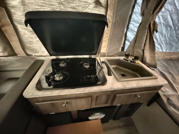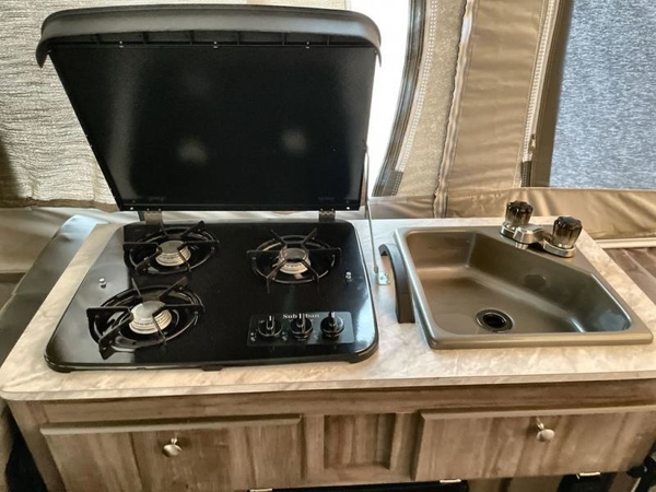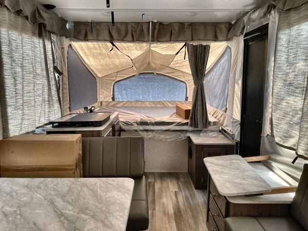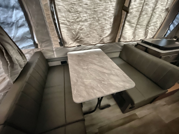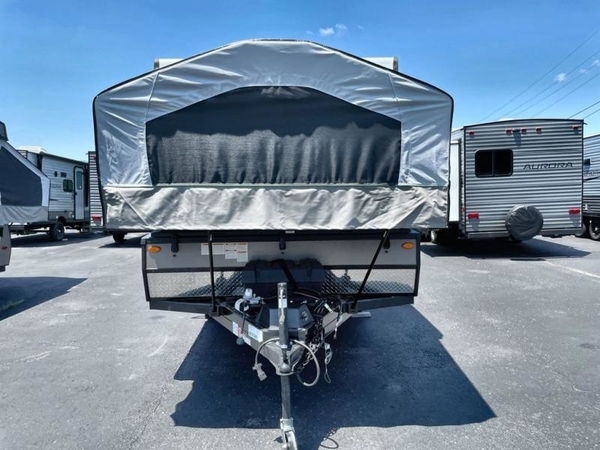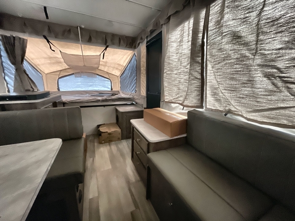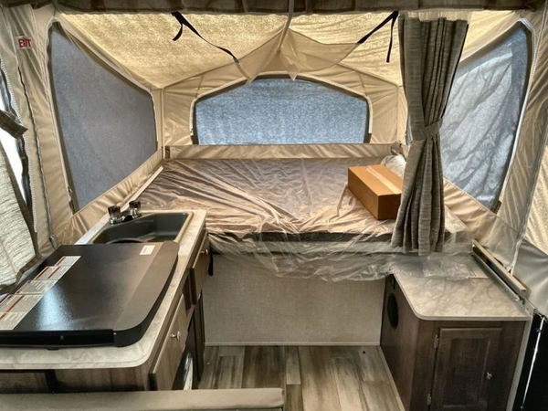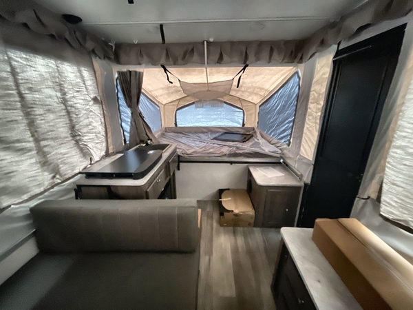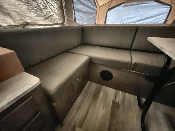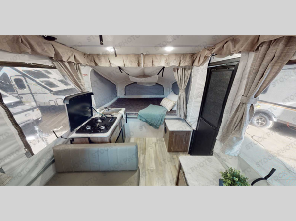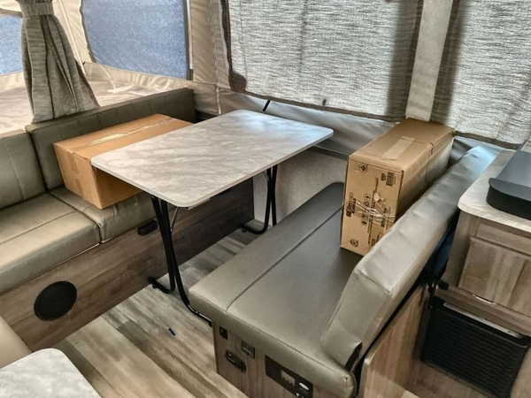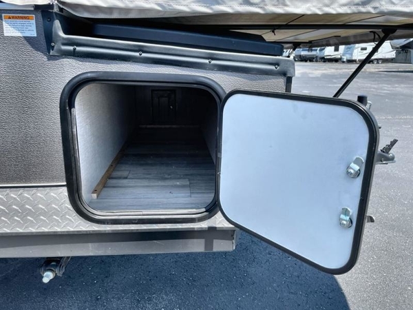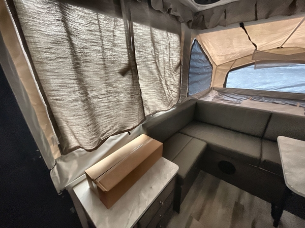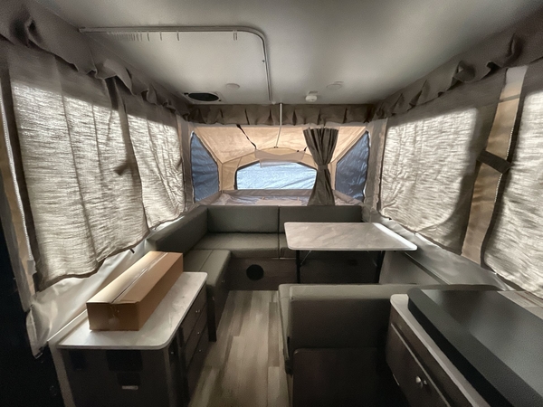 Starting off on a new adventure will be much easier to do with this Flagstaff SE folding pop-up camper! Before entering this camper, you will be met with an EZ-Reach storage trunk that can hold onto your equipment for easy access while traveling. You will also find an exterior griddle and 8' 6" awning for those nights when you just want to chill outside in the fresh air. Once you do step foot inside, you'll notice the swing galley directly in front of you. To your left is where the dinette with a table extension and L-shaped dinette are, and there is even a Port-A-Pottie for convenience at night. On either end of this camper, you will find a tent bed for a couple of tired travelers.