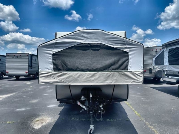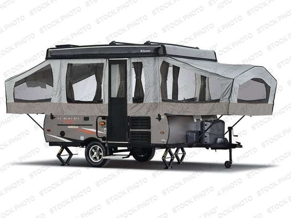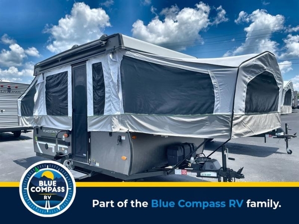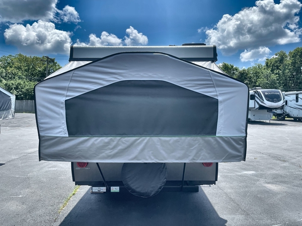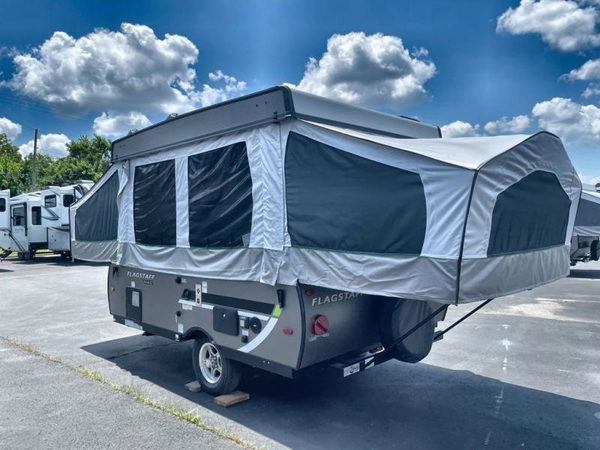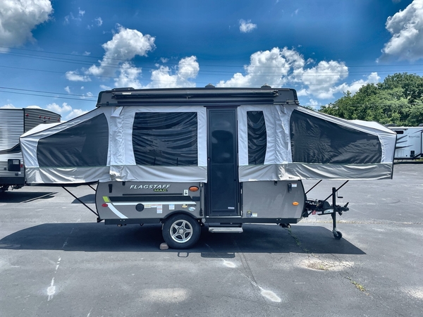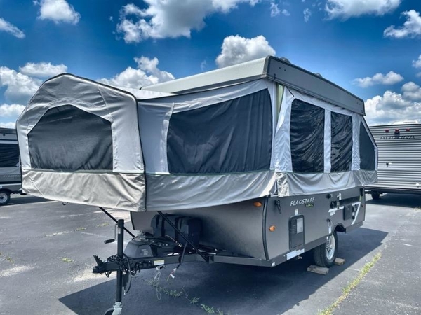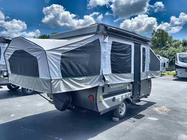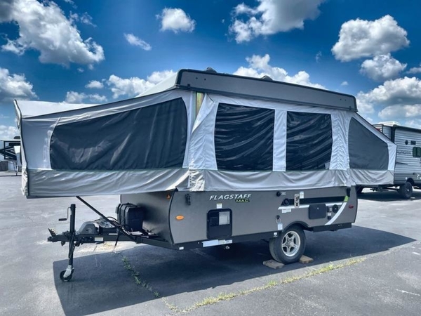 Retire the family tent for one of these Forest River Flagstaff MAC Series folding pop-up campers! Each trip will be one to remember because it will be so easy to load up and head out, yet you will still have what you need to enjoy your time away. The Flagstaff MAC Series includes Vinolon Supreme tenting material, storage nets over the bunks for your belongings, and heated mattress bunk ends for maximum comfort. Each model has a power roof lift and four stabilizer jacks with sand pads for easy set-up, a one-piece screen door to keep the bugs out, and ProRac permanent crossbars for durability. There are many more features that make the MAC Series folding pop-up camper the perfect camping trailer, like the exterior awning with LED lighting, the 20,000 BTU furnace, the 80" beds, and the list goes one!