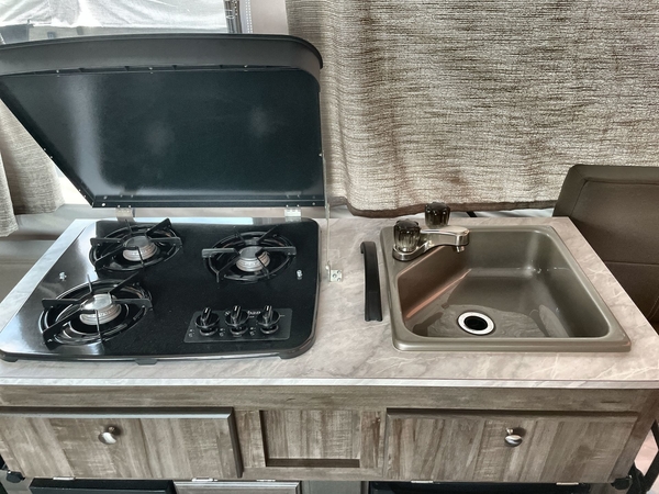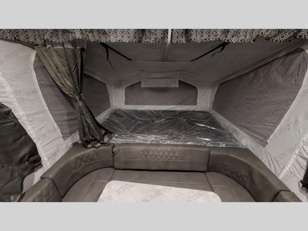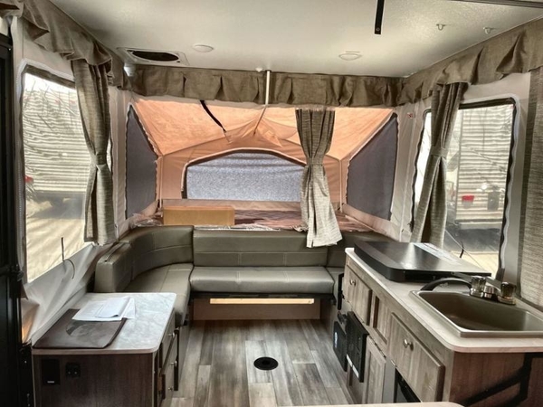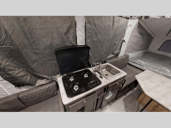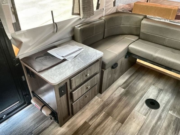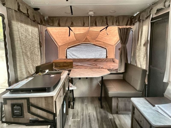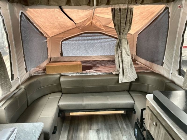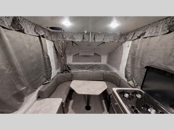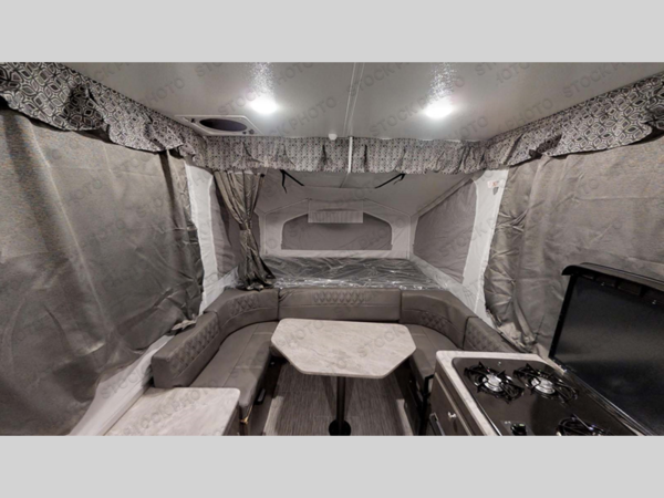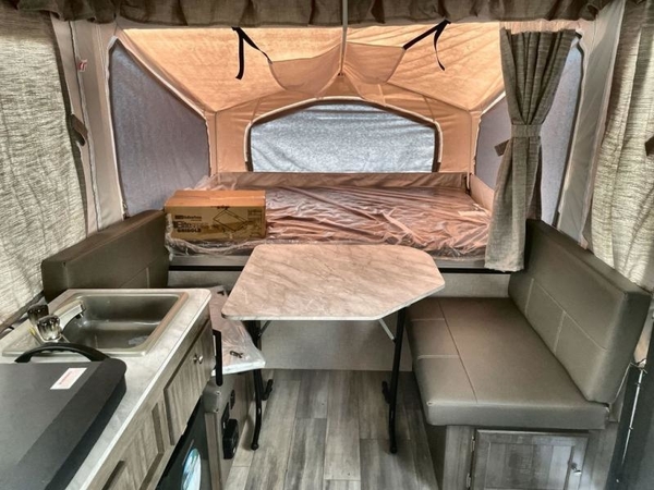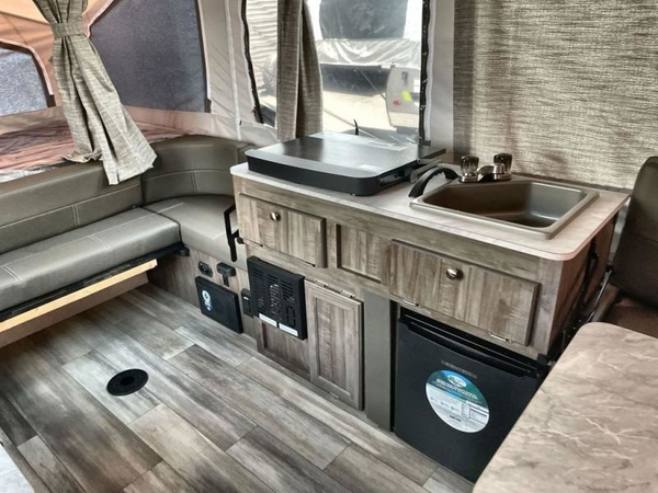 Excitement levels will be high when you take the family out in this Flagstaff MAC Series folding pop-up camper! You will have an easy time towing and setting up, and once you do make it to the campsite, you won't even have to start a fire in order to get dinner together because the permanently mounted indoor range and outdoor griddle will be ready to go. There is also a refrigerator that you can use to bring along some perishable items, and with both a U-shaped dinette and booth dinette, you'll certainly have plenty of dining space.