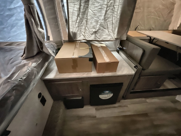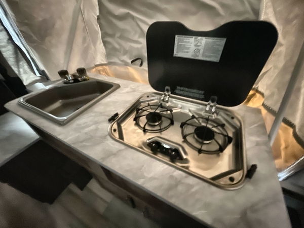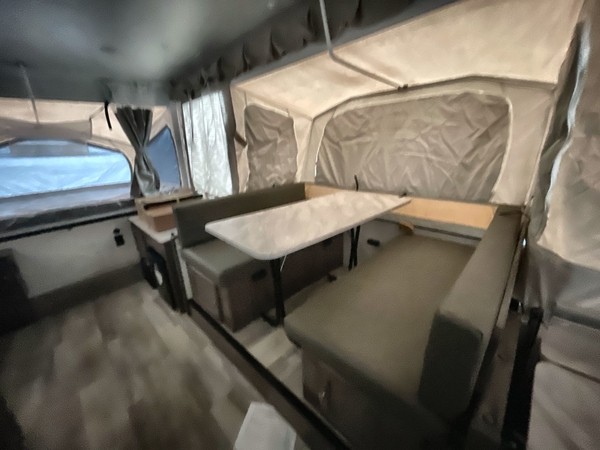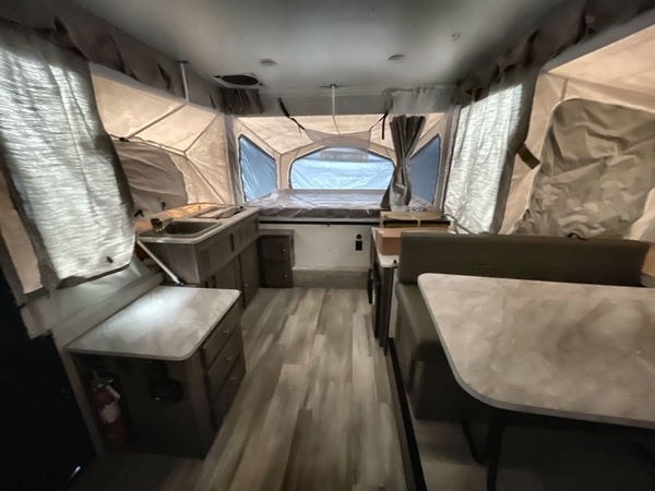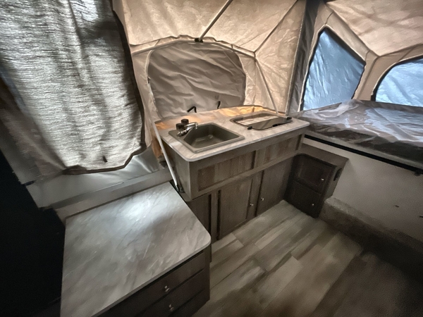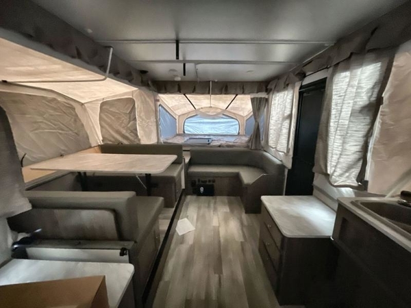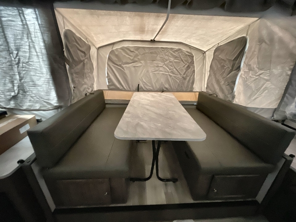 The first thing you're going to notice about this Flagstaff MAC Series folding pop-up camper is how spacious the interior is! The booth dinette sits on a single slide, so it can be moved out of the walkway which creates more room for you to just enjoy your time spent indoors. The L-shaped gaucho bed also offers some extra seating room while you're inside playing games or relaxing, and with the bay window at the permanently mounted indoor range, you can enjoy views of the campsite while you cook. This camper also has a great abundance of storage space with interior cabinets, the lift-up storage, exterior storage within the slide, and the EZ-reach storage trunk under the 70" 80" tent end bed. Another feature that you'll find extremely helpful are the USB charging ports.