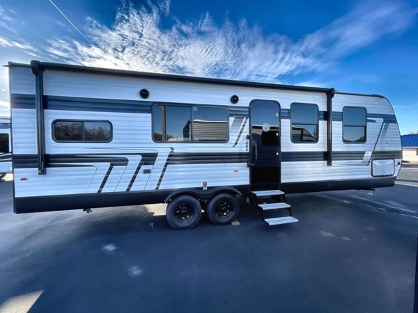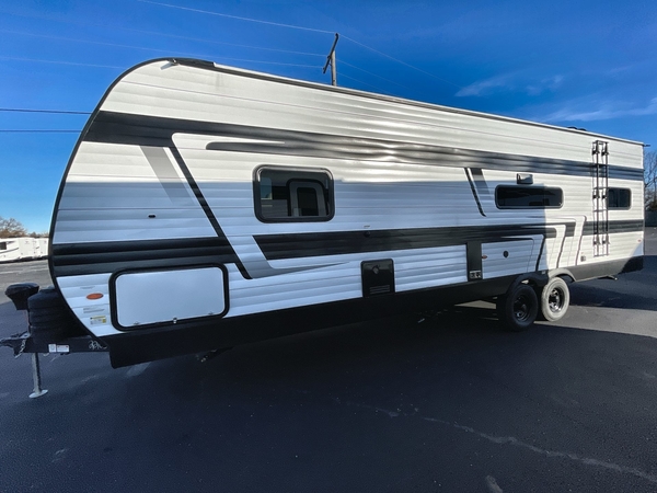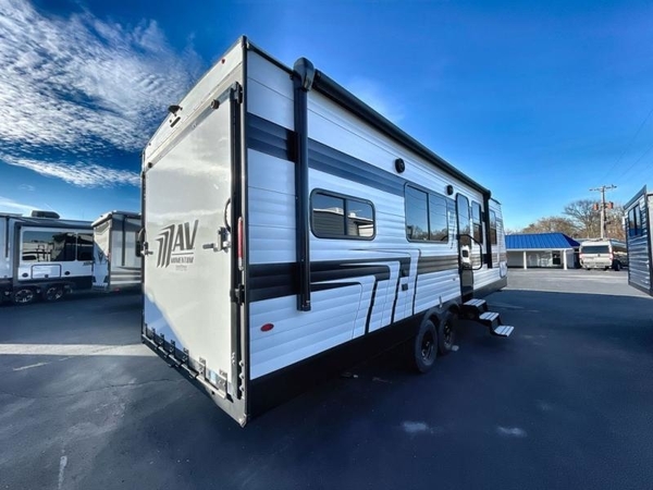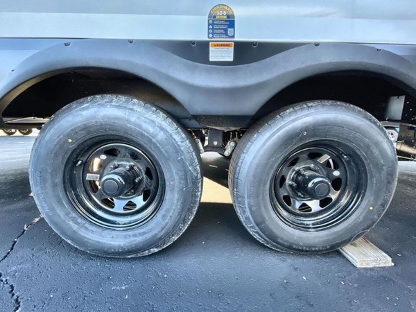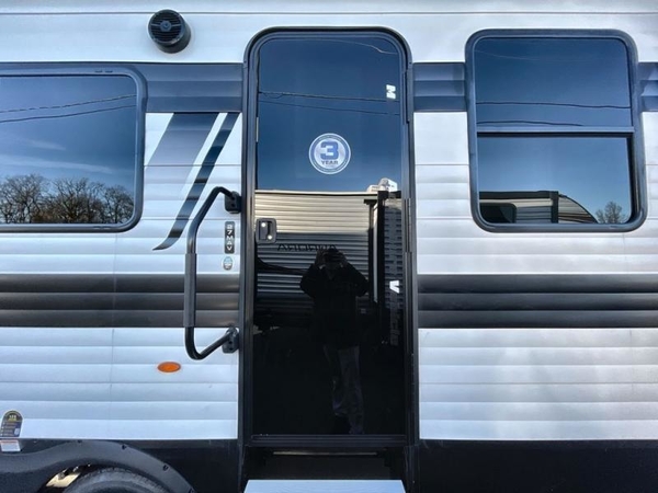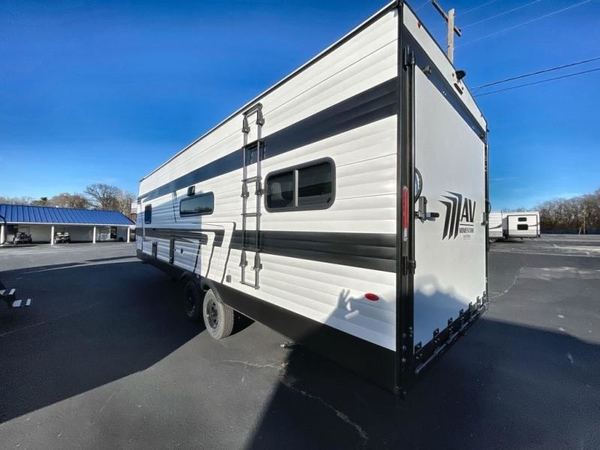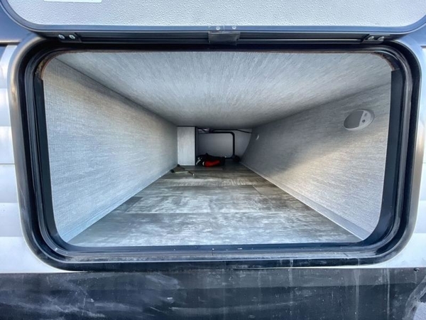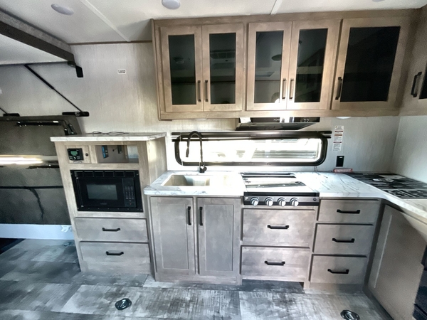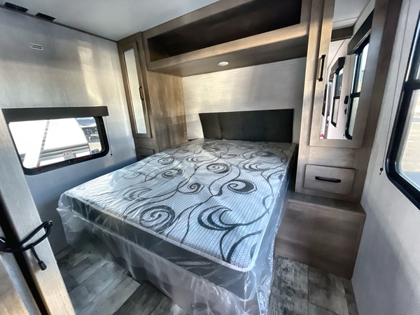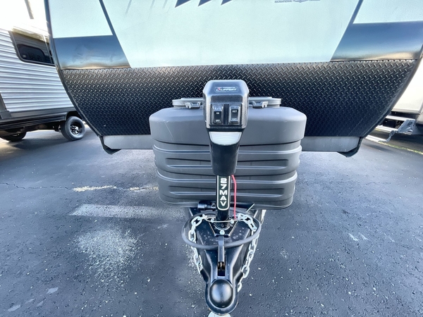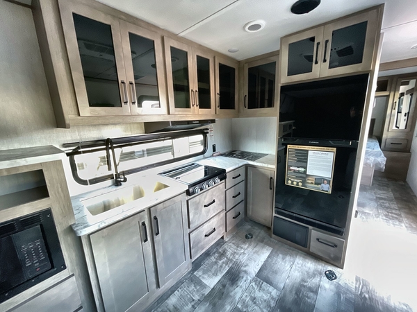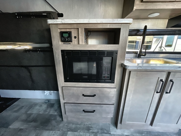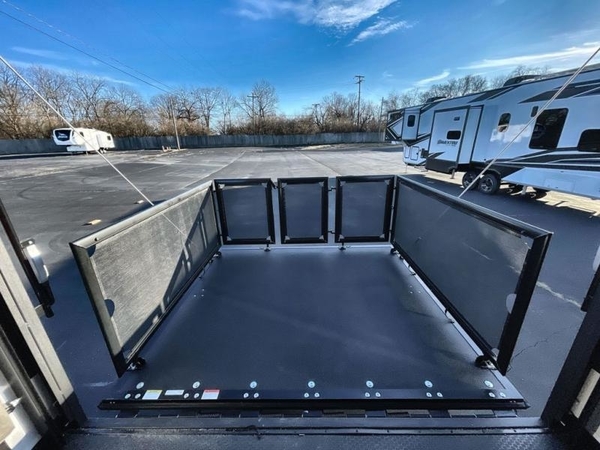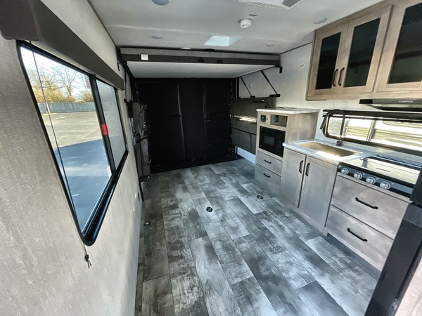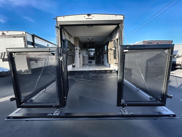 You will love this Momentum MAV toy hauler travel trailer! The front bedroom features a queen bed, and there is plenty of room to walk around. The sliding solid bedroom door helps with space. Overhead storage and a pair of nightstands are convenient storage, plus there is a wardrobe with both drawers and space to hang items. The kitchen offers a microwave, stainless steel sink, and 8 cu. ft refrigerator. There's even a pet drawer for your furry friend's dishes! In the garage, you'll find additional beds with a pull down bunk plus a pair of roll over sofas. Set up the removable table top to use the sofas as a dining area. Pull down the screen door, turn on the Rockford Fosgate stereo, and enjoy! Or use the ramp door/patio to sit outside in the fresh air.