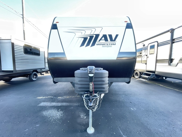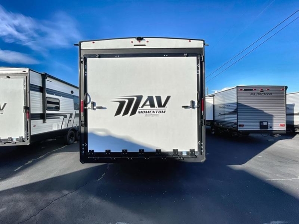 The Momentum MAV toy hauler travel trailers by Grand Design are designed to provide exactly what you need. The spacious garage provides tons of cargo space, with no wheel wells to get in the way. Additional storage includes unobstructed pass-through storage, underbed storage with a gas strut lift, and overhead consoles throughout. Conveniences like motion sensor lights and USB outlets will make your life easier, and you will be comfortable in all seasons with the 35K BTU furnace plus 15K BTU ducted air conditioning. This unit is prepped for two televisions in the living room and bedroom, if you need any more entertainment on your trip!
