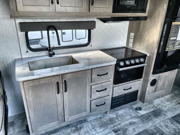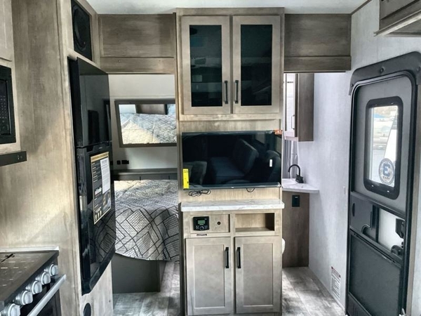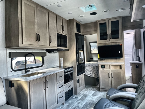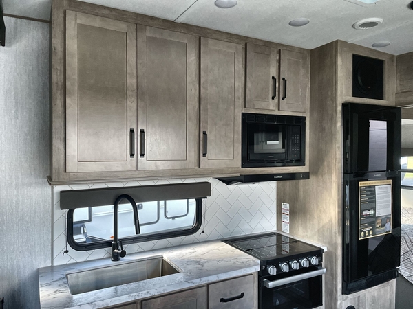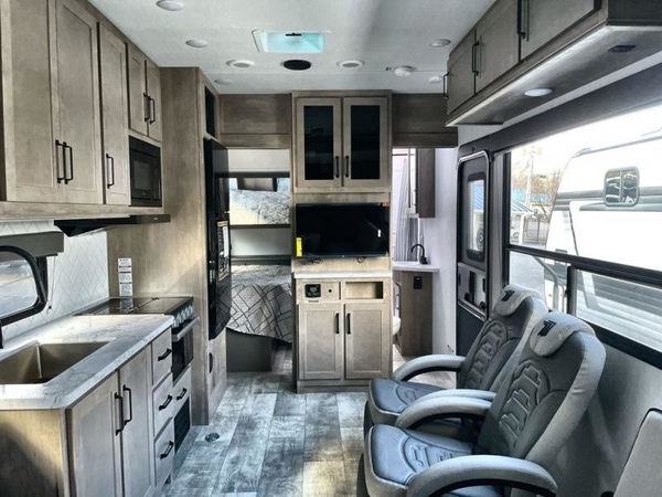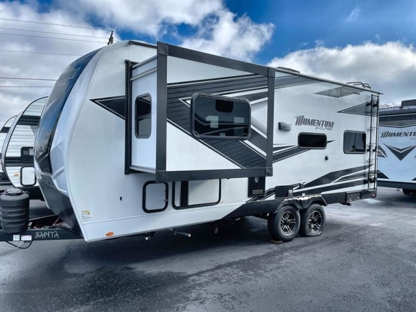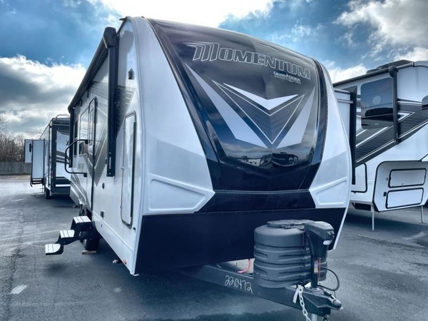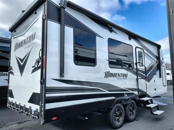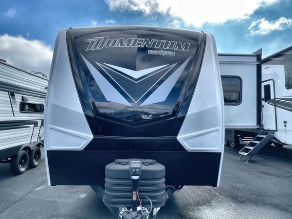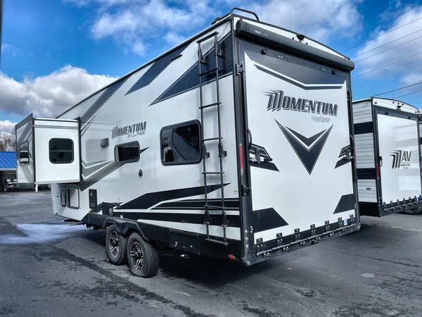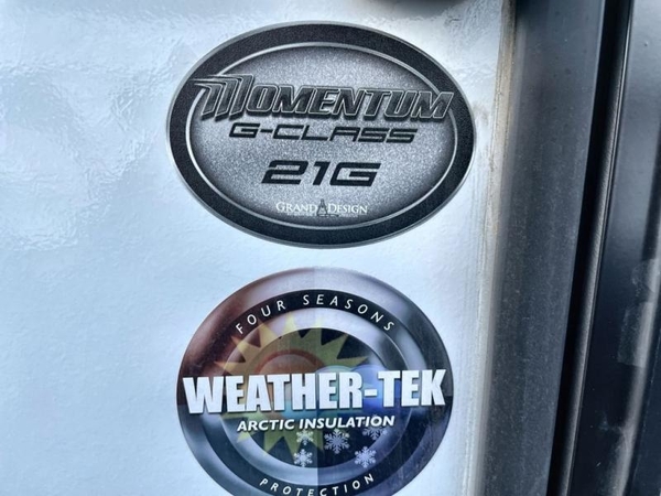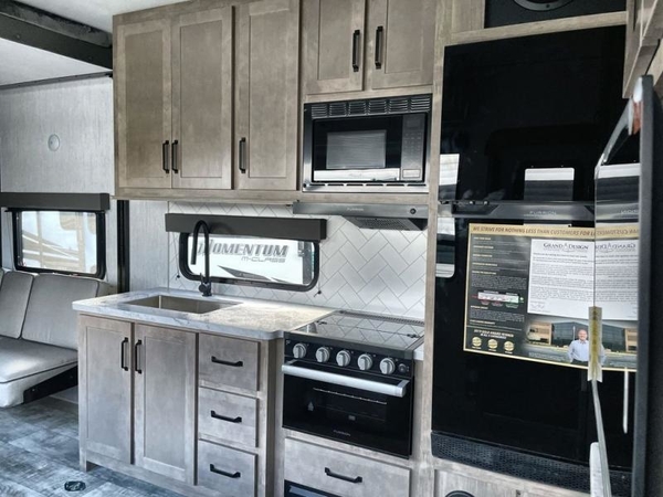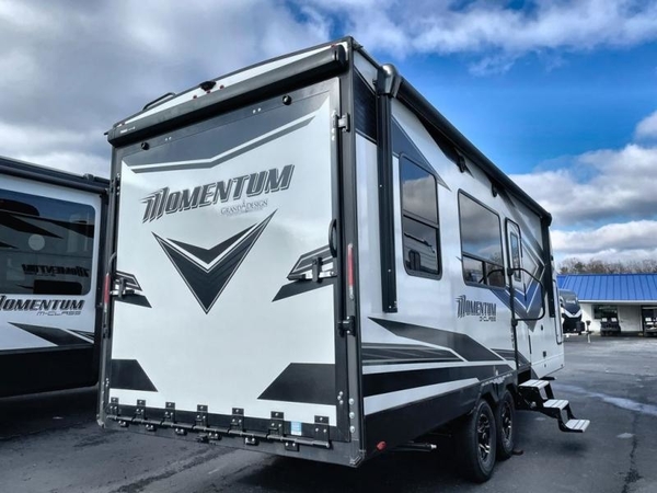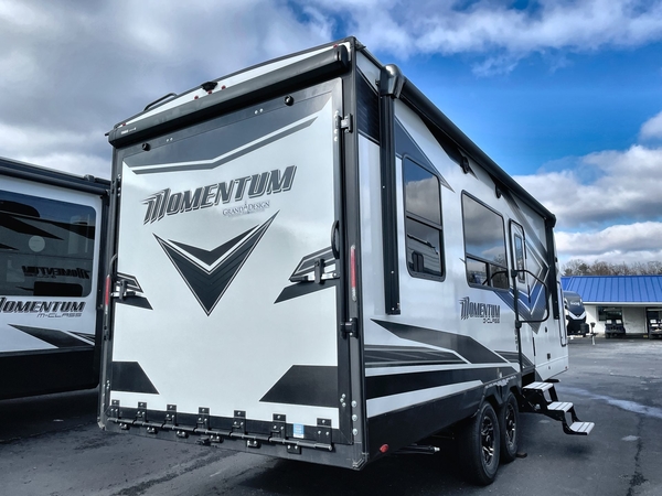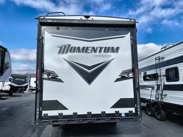 Are you looking for adventure and fun? The Momentum G-Class toy hauler by Grand Design will help you find it! You can explore during any season you choose with the Insulation Package that includes a heated and enclosed underbelly with suspended tanks, a high-capacity furnace, a moisture barrier floor enclosure, and cabinet-mounted heat ducts. Each model includes a 30-gallon fuel station with an interior and exterior gauge, a dovetail rear rend, and 2,500-LB tie-downs anchored into the chassis. Throughout the Momentum G-Class interior, you'll enjoy many comfortable features like large panoramic windows, a shower skylight, USB chargers in the bedroom, and residential cabinetry.