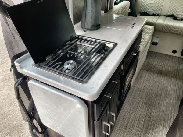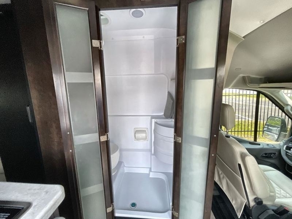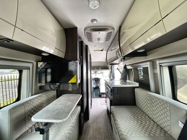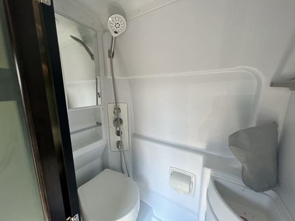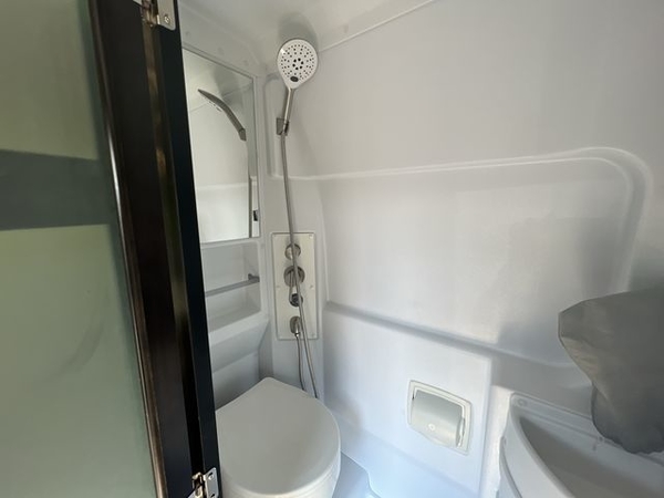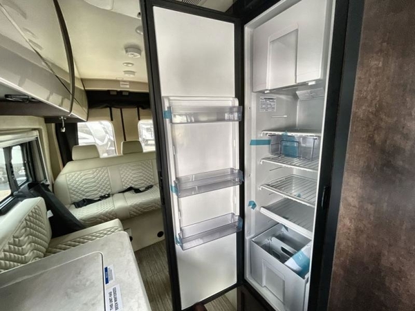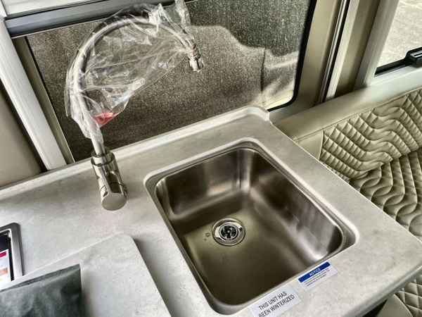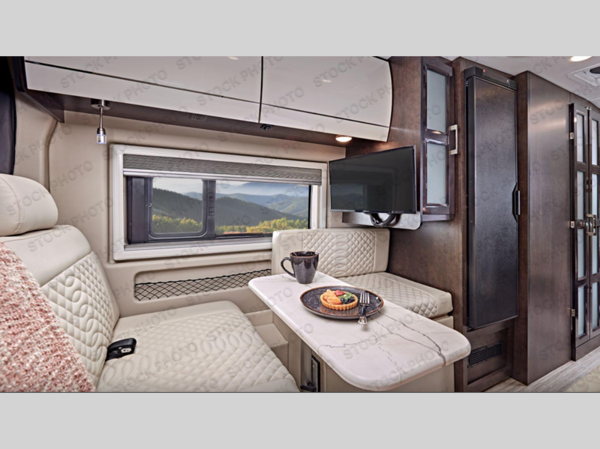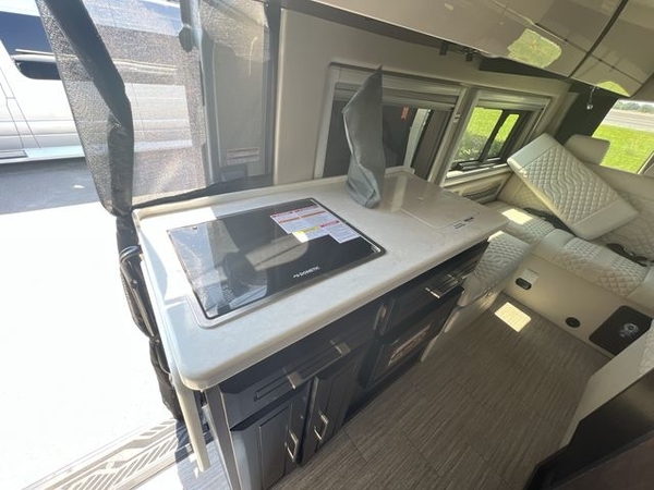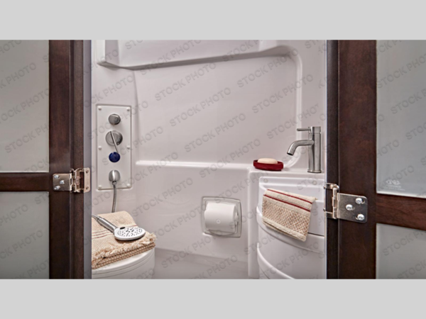 This couple's coach is ready to hit the road when you are! The rear 68" power sofa comes with a Lagun table mount to enjoy your meals at that were prepared with the one burner induction cooktop, convection microwave, and 5.3 cu. ft. refrigerator. If you want to eat a quick bite of food to get back on the road fast then simply swivel around from the captain and passenger chairs and set up the fold down table and Lagun table. Wash the travels away in the 25" x 46 3/4" wet bath with a magnetic curtain surround and Aqua View SHOWERMI$ER water management system to keep your water usage low. When you're ready for a good night's rest then convert the sofa into a 68" x 76" bed!