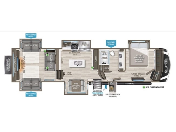 Each minute spent in this spacious fifth wheel will feel just like home! The rear living area includes a rear entertainment center with an LED Smart TV and a fireplace, overhead cabinets, theater seating, plus two tri-fold sofas for your guests to sleep on. You will have the front private bedroom all to yourselves with a queen bed slide out that can be switched out for an optional king bed, and the front closet provides all the space you need to store your belongings. This model includes a spacious full bath with a flip-up teak seat, a shower skylight, plus dual bath sinks for ultimate convenience. The chef of your group will love the middle kitchen with its convenient island including double sinks, a residential cooktop and 24" oven, 20 cu. ft. refrigerator, and free-standing dinette plus a hutch and buffet for storage. Head outdoors to find a 16' power awning with LED lights and middle pass through along with rear storage including a sliding tray, and you might want to add the optional pull-out kitchen.