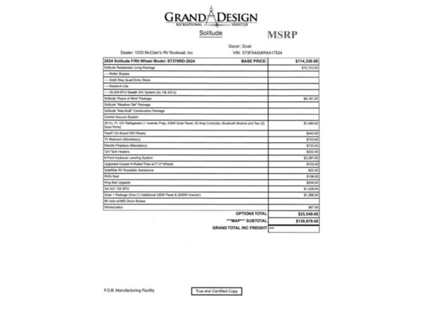 Each Solitude fifth wheel by Grand Design features a 101" wide-body construction, heavy duty 7,000 lb. axles, frameless tinted windows, and high-gloss gel coat sidewalls. You can camp year around thanks to the Weather-Tek Package that includes a 35K BTU high-capacity furnace, an all-in-one enclosed and heated utility center, and a fully enclosed underbelly with heated tanks and storage. Inside, you'll love the premium roller shades, hardwood cabinet doors, solid surface countertops and sinks, plus residential finishes throughout to make you truly feel at home. Each model also includes a MORryde CRE3000 suspension system, self adjusting brakes, and a MORryde pin box that will provide smooth towing from home to campground. Affordable luxury is possible with the Solitude fifth wheels; choose yours today!