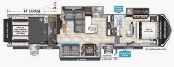 The 14 garage is located at the back of the fifth wheel and provides plenty of space to not only bring along your favorite toys but also to accommodate more friends and family with the Happi-Jac electric bunk system with removable sofas and a half bath. There is even a loft bed above the garage accessible from the living room.
