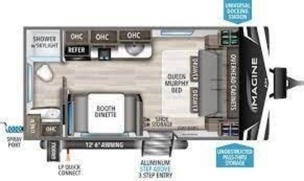Grand Design Imagine AIM 15RB travel trailer highlights: Murphy Bed Booth Dinette Full Rear Bathroom Outside Griddle Start looking for your favorite campground to take this travel trailer to! After a fun day at the beach, you can rinse the sand out of your hair with the walk-in shower with a skylight in the full rear bathroom. Depending on what time you enter the unit will determine whether you see the queen Murphy bed or sofa with drawers underneath and wardrobes on either side of it. The booth dinette is not only great for enjoying meals prepared with the two burner cooktop or outside griddle, but also for transforming into an extra sleeping space!