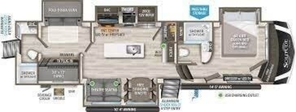 The Solitude 3950BH boasts a unique layout with a versatile bunkhouse that accommodates guests or serves as a flexible space for work or play. The master suite offers a king-size bed, premium bedding, and a spa-like bathroom, providing a true sanctuary for relaxation. The exterior showcases sleek lines, advanced construction materials, and a large awning for an outdoor living space. Practical features like a reliable towing system and energy-efficient systems enhance the overall travel experience, making the Solitude 3950BH a top choice for those seeking the pinnacle of RV living.