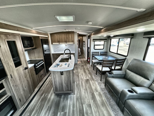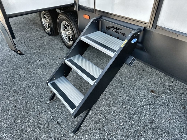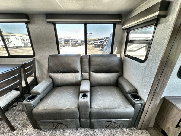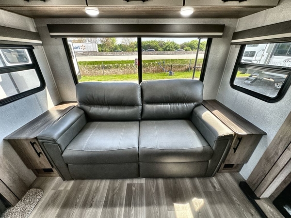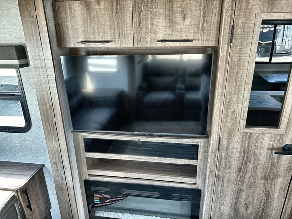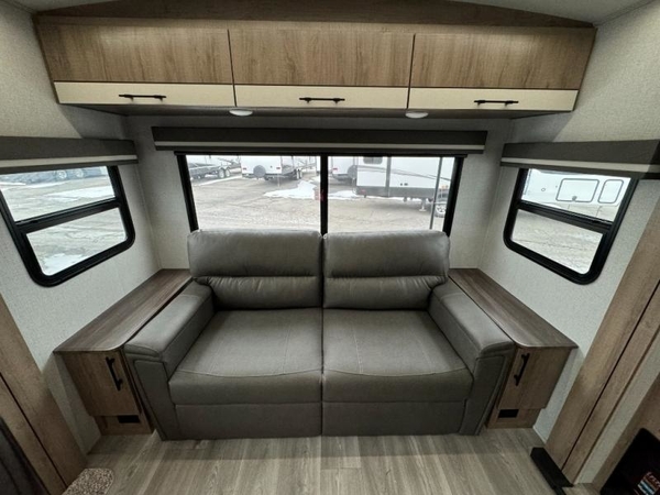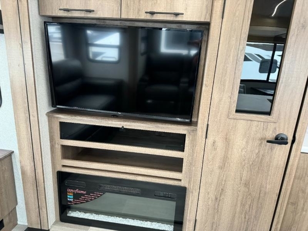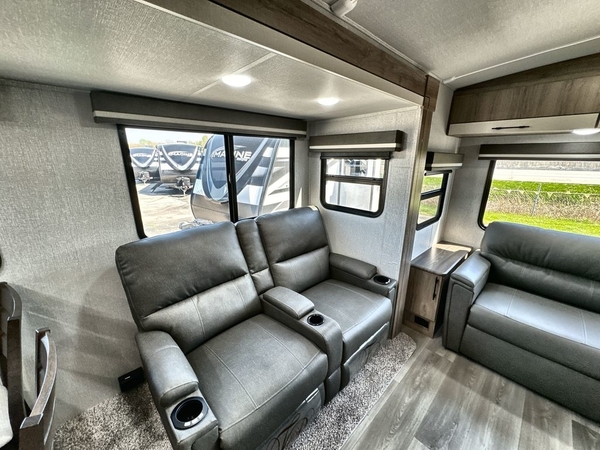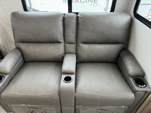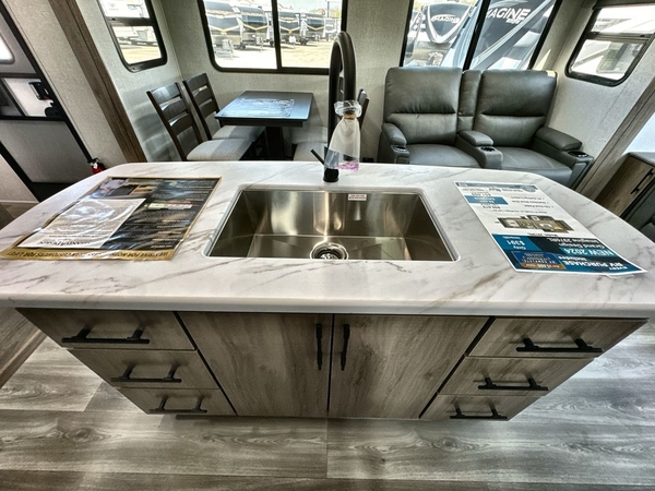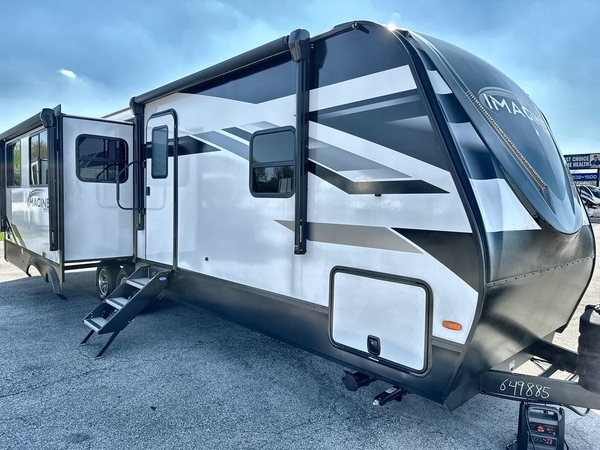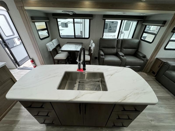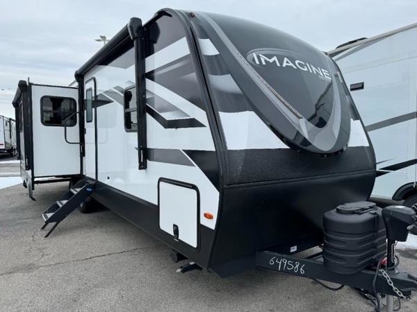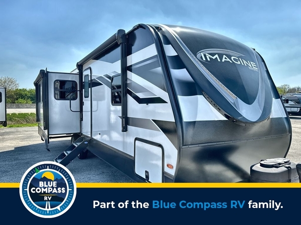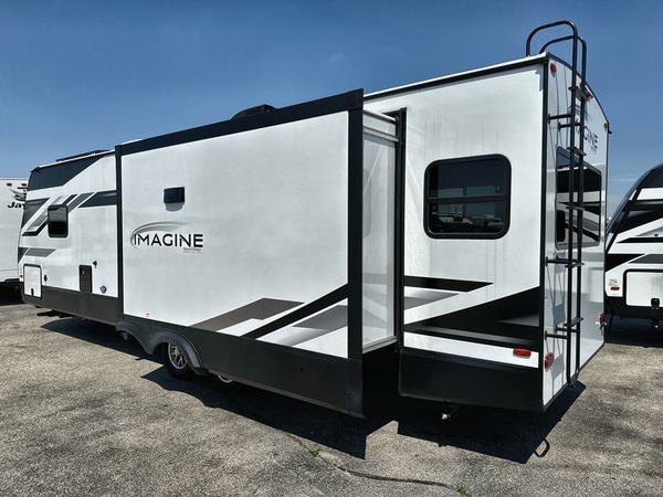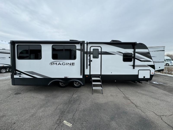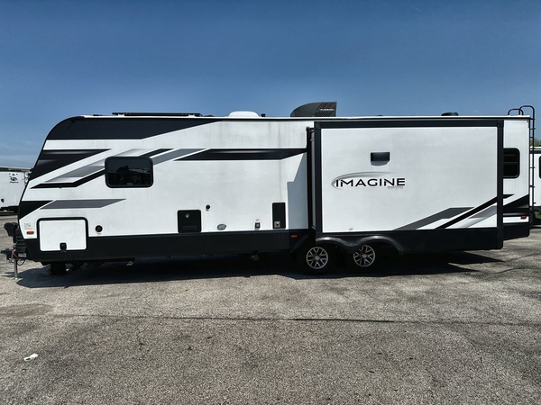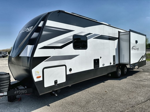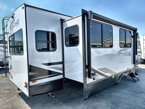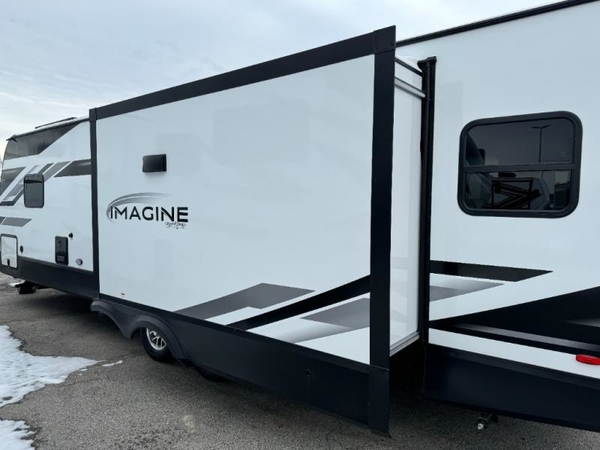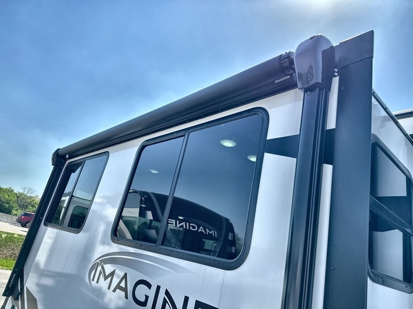 This Imagine travel trailer has opposing slides to provide you with ample living space on the interior once you've parked and set up! You can use the tri-fold sofa and theater seating to relax, and the booth dinette is another seating space that you can use for dinner time or game nights. The entertainment center has a 40" LED HDTV with fireplace below, which is great for movie night.  When outside, you will love the two power awnings to sit beneath to keep you protected from the sun while you have fun at your campsite. The exterior also offers you an LP quick connect and a coax TV hookup.