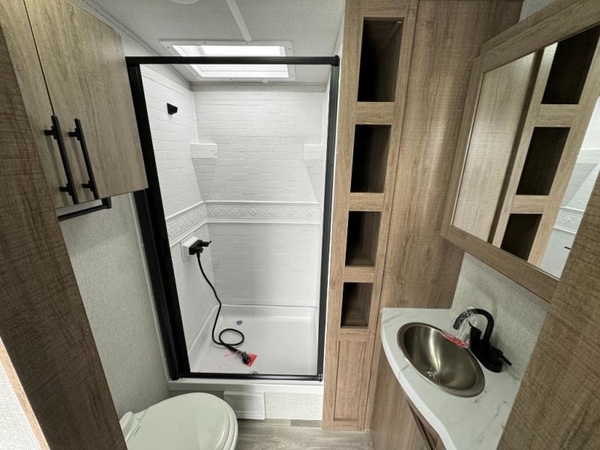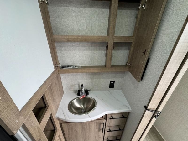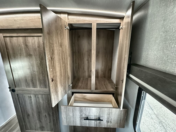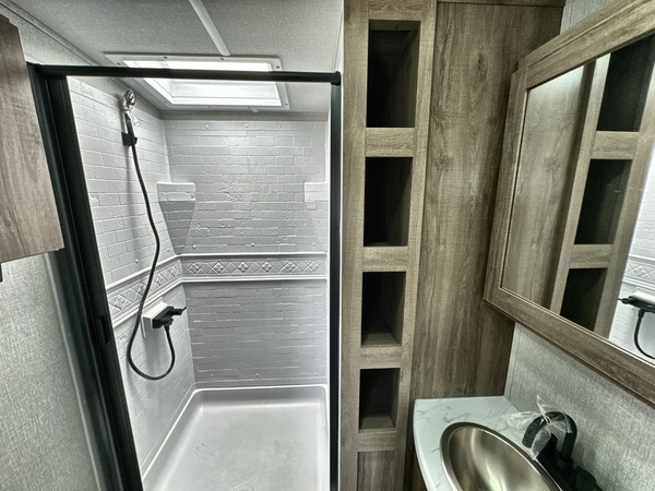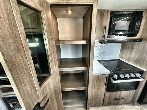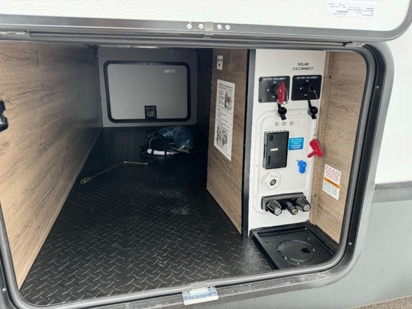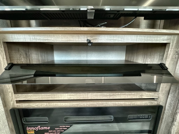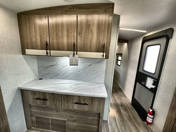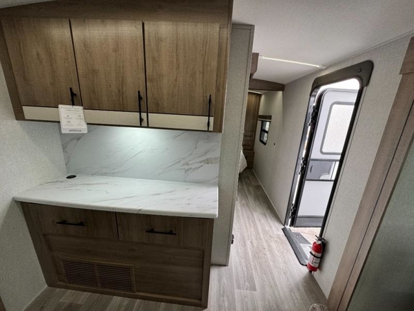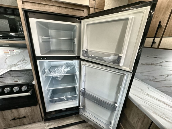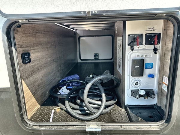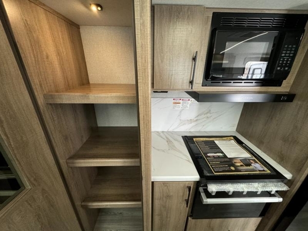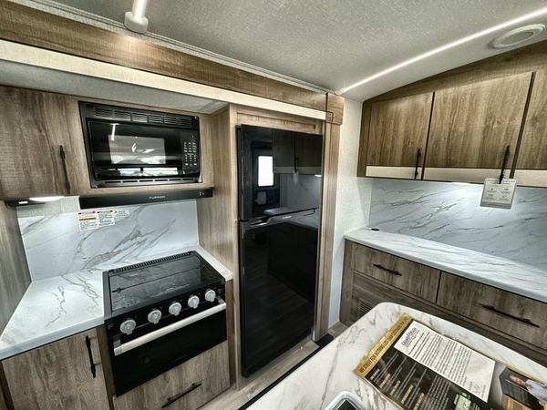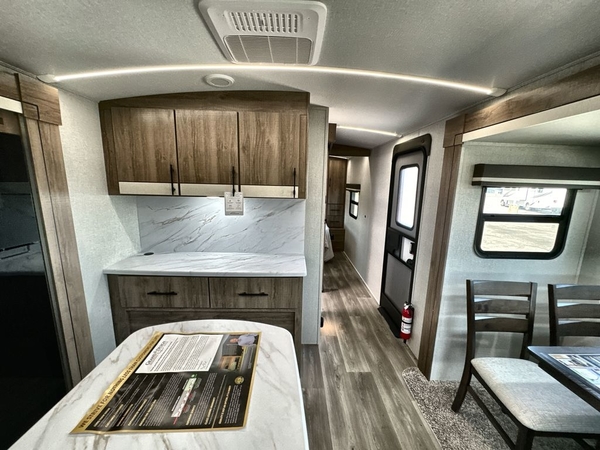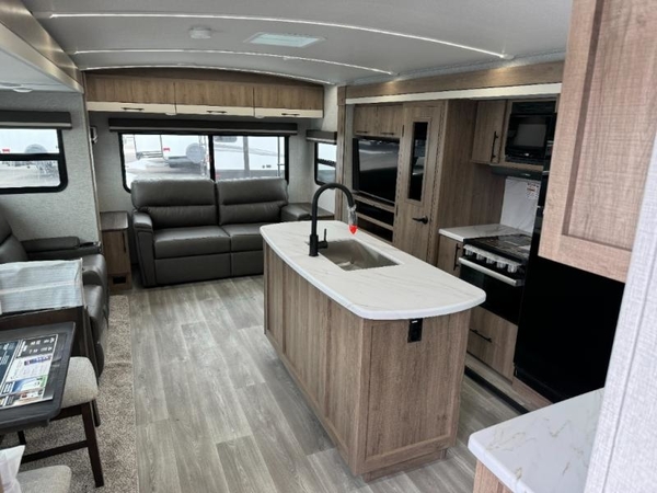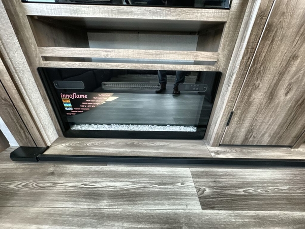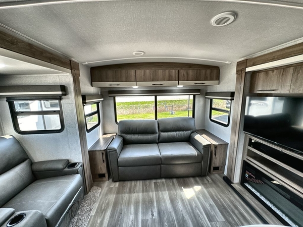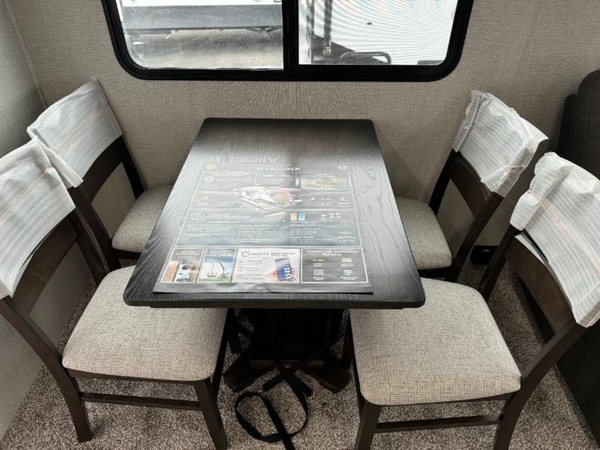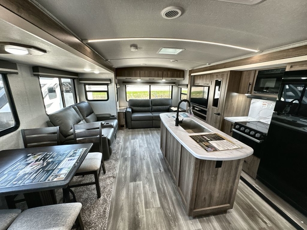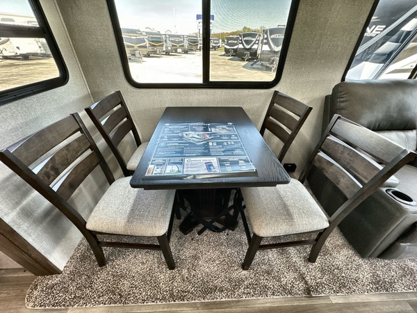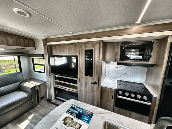 This Imagine travel trailer has opposing slides to provide you with ample living space on the interior once you've parked and set up! You can use the tri-fold sofa and theater seating to relax, and the booth dinette is another seating space that you can use for dinner time or game nights. The entertainment center has a 40" LED HDTV with fireplace below, which is great for movie night.  When outside, you will love the two power awnings to sit beneath to keep you protected from the sun while you have fun at your campsite. The exterior also offers you an LP quick connect and a coax TV hookup.
