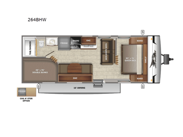 This family-friendly trailer offers the kids a set of double-size bunks so they can invite their friends to stay the night with them or on the furniture that doubles as extra sleeping space. The owners will have a semi-private bedroom up front with a walk-around queen bed, two wardrobes, an overhead shelf and a curtain to close for privacy. The chef will have a three-burner range and microwave to whip up meals, plus a 6 cu. ft. refrigerator to store leftovers. The toilet and tub/shower room allows everyone privacy when changing, and the bathroom sink is just outside the door allowing some to wash their face while another is taking a shower. And don't forget about the 16' power awning that offers protection from the elements, and you might like to add the Chil N' Stor option if you want cold food or beverage storage along the exterior.