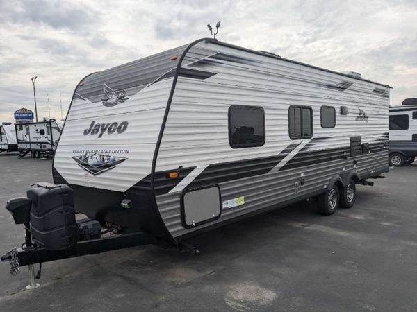 With any Jayco Jay Flight SLX Western Edition 8'-wide travel trailer, the exterior offers equipment such as l-Class cambered structural steel l-beams, seamless roof material, the Magnum Truss roof system, large exterior downspouts, rooftop solar prep, and an LP quick connect/outside grill prep. There is a mandatory Customer Value package providing even more features such as Goodyear Endurance tires made in the USA, a front diamond plate to protect against debris, and four stabilizer jacks. The interior offers residential-style kitchen countertops, a wood-trimmed mirror in the bathroom, vinyl flooring throughout including slide floors for easy care and durability, and a roof-mounted 13,500-BTU A/C. Take a look and you will be able to pick the right camper for you!