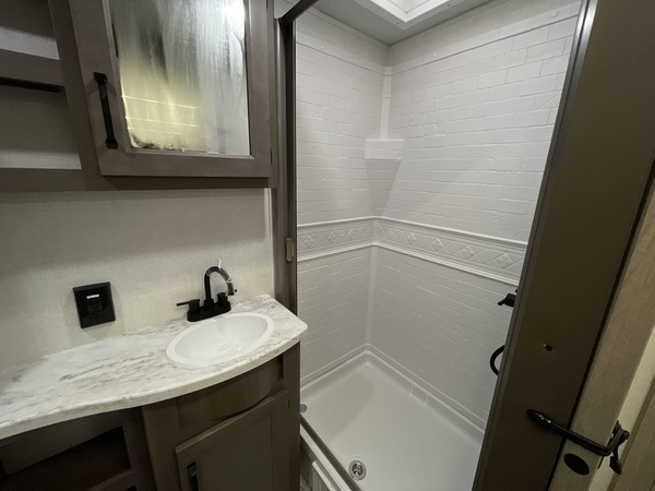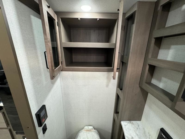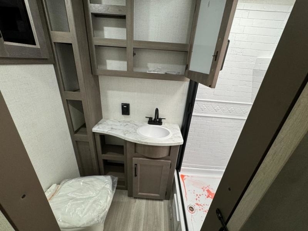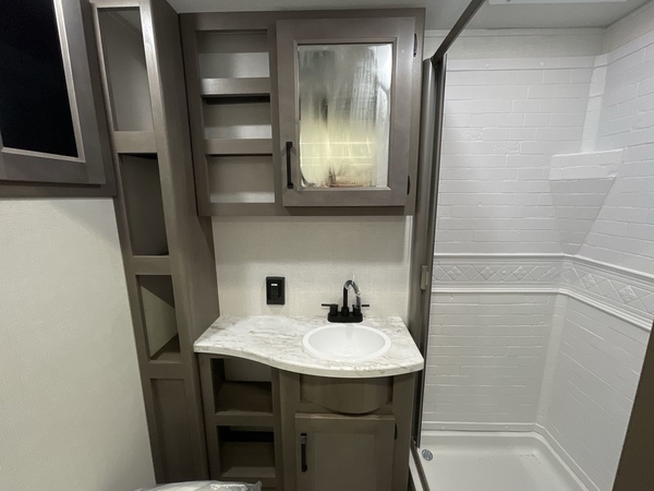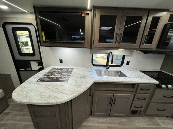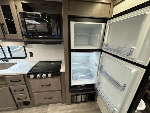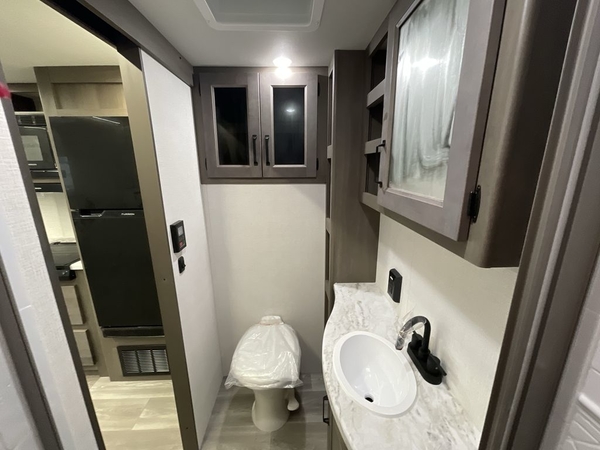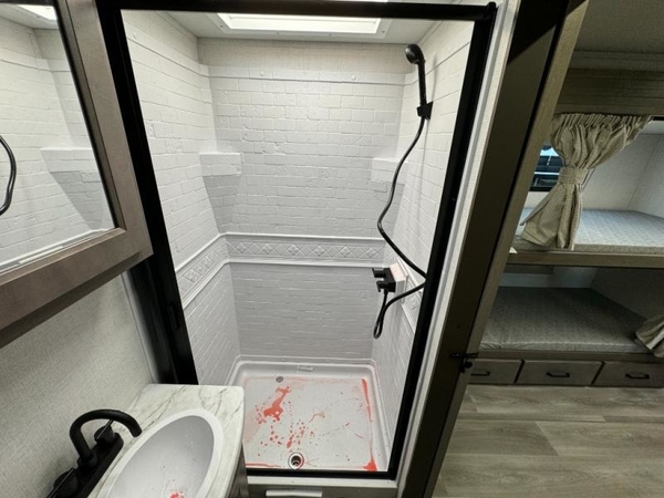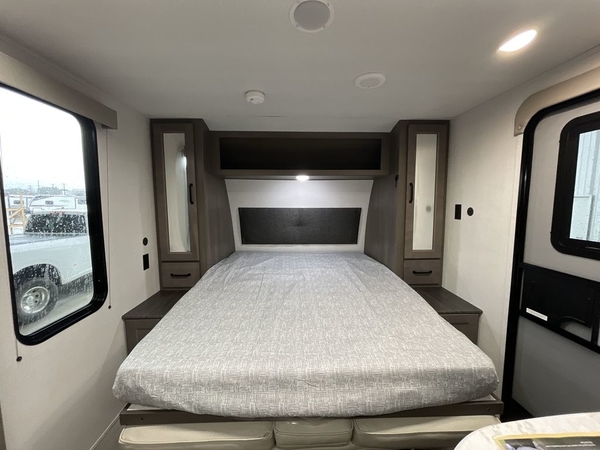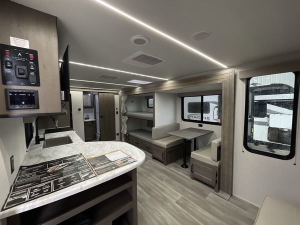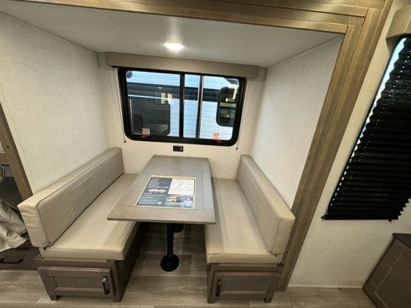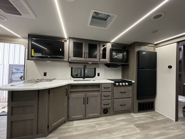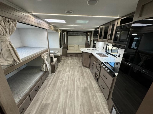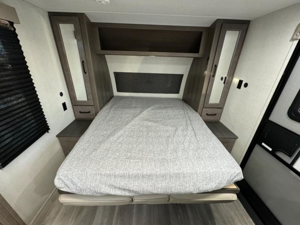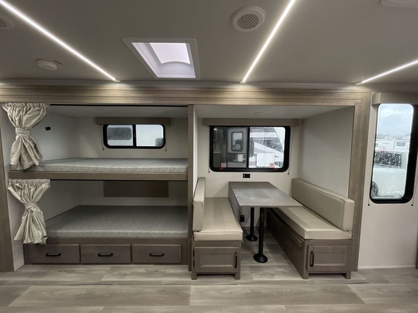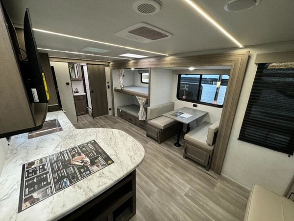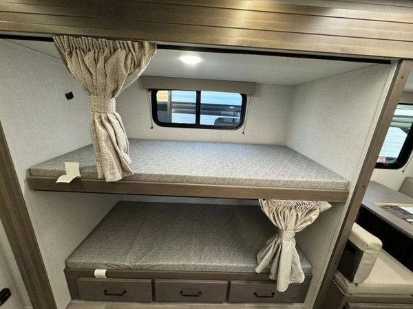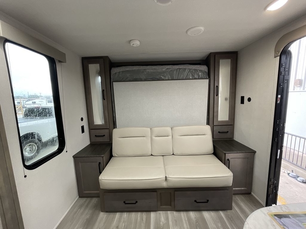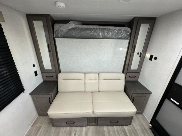 Camping trips in this travel trailer are fun for everyone. You will love the versatile queen Murphy bed up front that can fold away each morning; now you can relax on the sofa! There are bunk beds with drawers and a booth dinette within the large slide out, or you can choose the optional sleeper sofa and theater seats instead. Everyone will stay entertained with having a 32" LED TV on board, or you can enjoy fresh air outdoors under the 19' power awning. There is even an outside kitchen here! And when you're ready to call it a night, you can clean up in the full rear bath that includes plenty of storage for all your necessities.