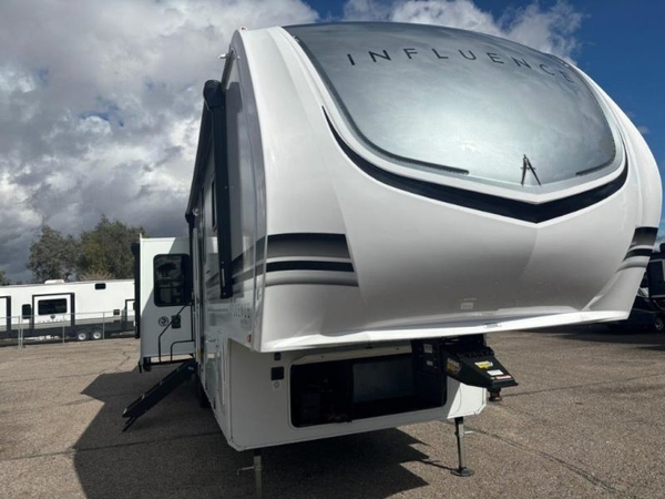 Any Grand Design Influence fifth wheel features five-sided aluminum cage construction with a walk-on roof and a fully enclosed underbelly with heated tanks and storage for all weather camping. For peace of mind, the MORryde CRE3000 Suspension system and ABS braking system will provide safe and smooth towing, and the 101" widebody construction offers all the room you need and that is before multiple slides are fully engaged. You will appreciate the keyed alike locks, slam-latch baggage doors with magnetic door catches, exterior security light, and solid surface entry steps. On the inside, Congoleum flooring, premium roller shades for privacy, a hallway handrail for safety, and nightstands with USB ports to keep all of your electronics fully charged. You will also love the On Demand tankless water heater when showering, plus the added heat and ambiance from an electric fireplace, and so much more!