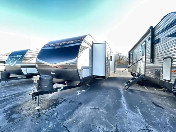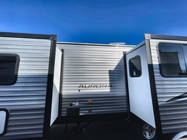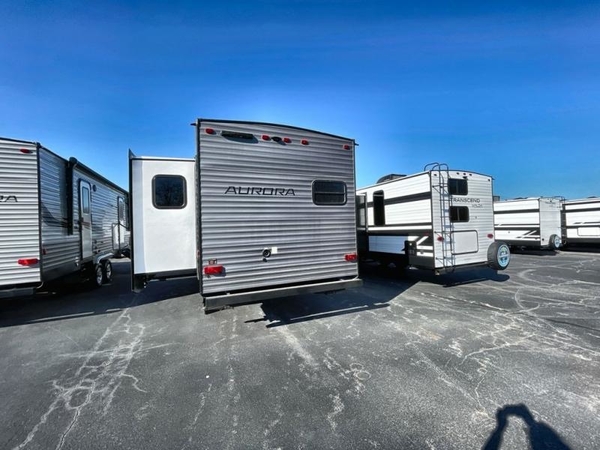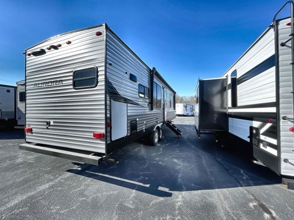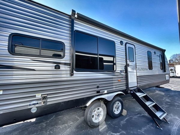 Comfortability, usability, and quality is what you will find in each one of these Forest River Aurora travel trailers, toy haulers or destination trailers! They are designed with a superior build and packed full with industry leading, functional, and distinctive standard features. SolidStep entrance steps and a Safe-T rail door assist on main entry door to help you safely enter and exit the unit. The diamond plate rock guard will protect your unit from road debris and the nitrogen filled radial tires, which keep their pressure longer, offer better fuel economy. You will also find upgraded JBL Elite exterior speakers outside, an electric awning with multicolor lights and remote, plus flush mount baggage doors for easy packing. The interiors are beautifully designed with a deep undermount farm style sink, stainless steel appliances, and linoleum flooring throughout which will be easy to clean. Come find your favorite model today!