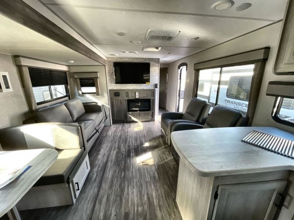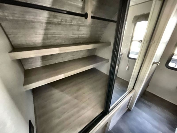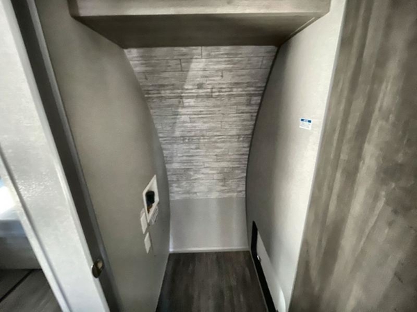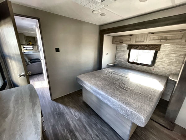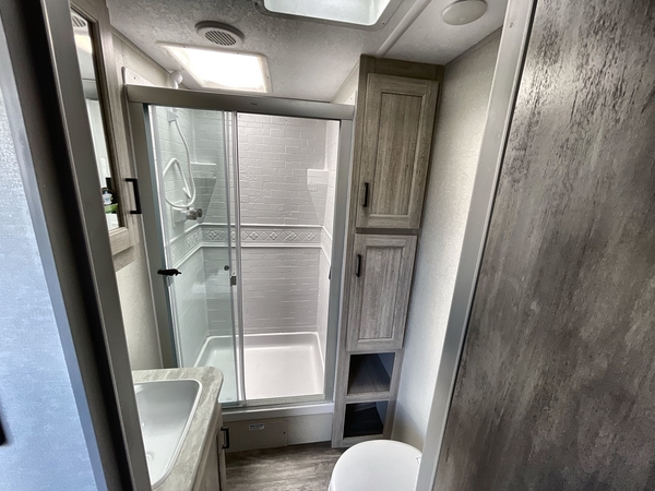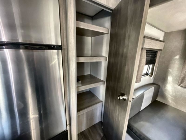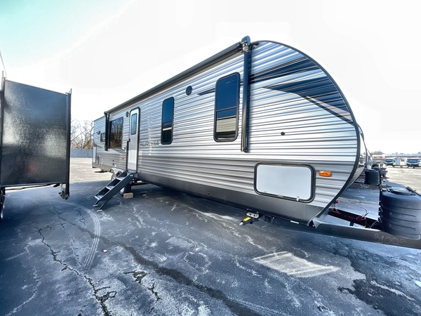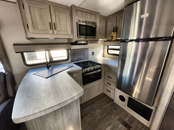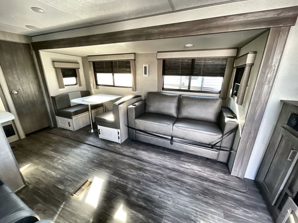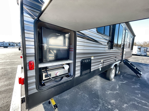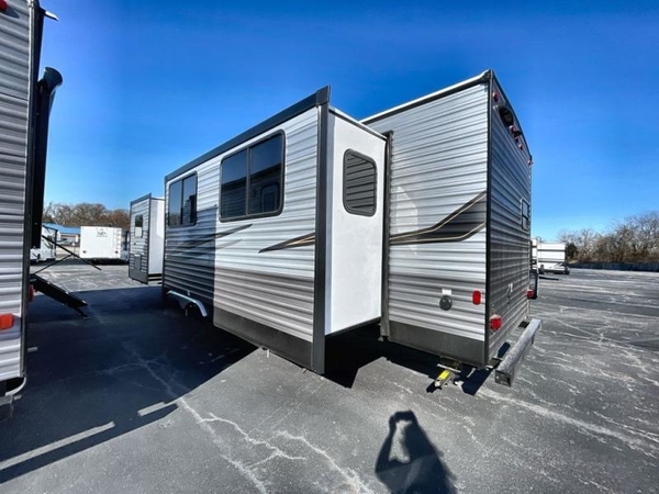 This travel trailer is decked out in convenient features from the dual entry doors to the outside camp kitchen with a sink, a refrigerator, a grill, drawers for your utensils, and overhead cabinets for extra cooking necessities! The rear private bunkhouse has an upper bunk bed above a 68" jackknife sofa, a 40" x 74" loft bed with a TV/wardrobe cabinet below it and a wardrobe with drawers next to it to keep everything neatly tucked away. The full bathroom has a 24" x 40" full tub for everyone to freshen up in and an entrance/exit door so you can get back to having fun outside fast. You can prepare your best meals with the three burner cooktop then enjoy them at the U-shaped dinette and let your stomach settle afterwards on the 60" sofa near the entertainment center with an optional fireplace!