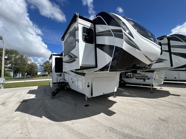 Five slide outs, a full bathroom with dual sinks, a half bath off of the kitchen, and a separate front living room and entertainment area are a few reasons you will enjoy your time spent in this fifth wheel! The separate kitchen is a dream with stainless steel appliances including a 24" residential oven, a pantry and hutch with counter space, a kitchen island plus a free-standing dinette slide with windows for great views. The entertainment center offers an LED Smart TV with a fireplace below and storage, and the dual opposing tri-fold sofas provide added sleeping space at night. The master bedroom includes a queen bed, LED TV and storage, plus space savings sliding doors that lead you to the rear full bathroom with dual sinks, linen storage, and washer/dryer prep. You will find more storage throughout the fifth wheel in the overhead cabinets, the entry closet, and even your shoes have a spot under the interior steps leading to the front living/entertainment room. The exterior has several storage choices as well including a pass-through compartment for fishing poles and such, plus the unique sliding tray in the rear allows you to bring along larger items such as camping tables, portable grills, golf clubs, totes and more.
