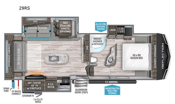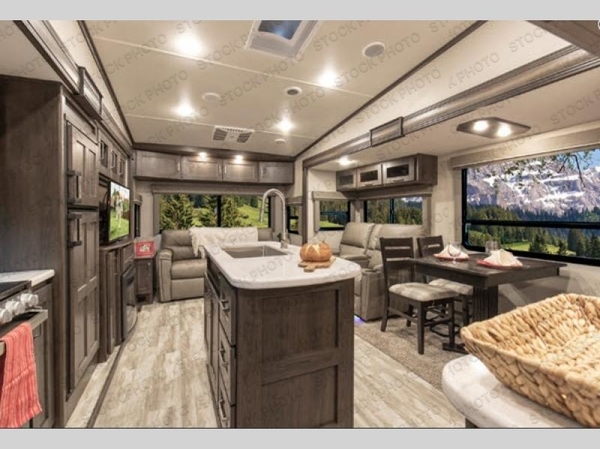 This Refection fifth wheel allows you to cook in a gourmet kitchen with a center island and large sink, plus watch your favorite movies on the 40" TV while keeping warm and cozy from the fireplace below. Your spouse may even be watching the TV from the theater seats or napping on the tri-fold sofa. When it's time for bed, you can get cleaned up in the radius shower located in the dual entry bath, and then sleep on a queen bed inside the front private bedroom. You will find plenty of storage throughout for your clothes, dry goods, games, and blankets, plus there is an exterior unobstructed pass-through compartment that allows you to store larger items. It's time to get moving and start living the dream!