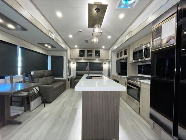 You'll feel right at home in this spacious fifth wheel with triple slides, a front master bedroom, and a kitchen island with extra counter space. The theatre seating is right across from the entertainment center which includes a 40" TV and fireplace, and there is a rear tri-fold sofa if you have any guests staying over. This model includes a hutch in the kitchen with cabinets above to store you nice dishes, plus there is a large pantry with washer and dryer prep if you plan to go full-time. Head to the dual entry bath that includes a linen closet and a spacious shower with a skylight, and check out the front master bedroom with its queen bed, and slide out wardrobe. You can choose the optional king bed if you enjoy a bit more room in bed!