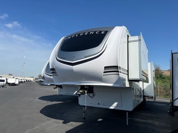 Any Grand Design Influence fifth wheel features five-sided aluminum cage construction with a walk-on roof and a fully enclosed underbelly with heated tanks and storage for all weather camping. For peace of mind, the MORryde CRE3000 Suspension system and ABS braking system will provide safe and smooth towing, and the 101" widebody construction offers all the room you need and that is before multiple slides are fully engaged. You will appreciate the keyed alike locks, slam-latch baggage doors with magnetic door catches, exterior security light, and solid surface entry steps. On the inside, Congoleum flooring, premium roller shades for privacy, a hallway handrail for safety, and nightstands with USB ports to keep all of your electronics fully charged. You will also love the On Demand tankless water heater when showering, plus the added heat and ambiance from an electric fireplace, and so much more!