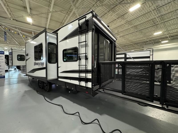 Are you looking for adventure and fun? The Momentum G-Class toy hauler by Grand Design will help you find it! You can explore during any season you choose with the Insulation Package that includes a heated and enclosed underbelly with suspended tanks, a high-capacity furnace, a moisture barrier floor enclosure, and cabinet-mounted heat ducts. Each model includes a 30-gallon fuel station with an interior and exterior gauge, a dovetail rear rend, and 2,500-LB tie-downs anchored into the chassis. Throughout the Momentum G-Class interior, you'll enjoy many comfortable features like large panoramic windows, a shower skylight, USB chargers in the bedroom, and residential cabinetry.