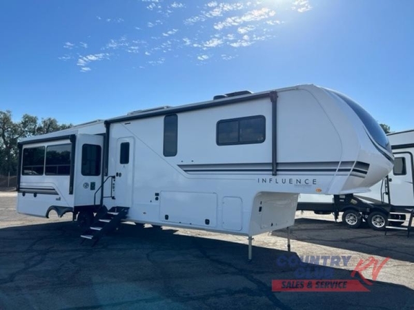 Any Grand Design Influence fifth wheel features five-sided aluminum cage construction with a walk-on roof and a fully enclosed underbelly with heated tanks and storage for all weather camping. For peace of mind, the MORryde CRE3000 Suspension system and ABS braking system will provide safe and smooth towing, and the 101" widebody construction offers all the room you need and that is before multiple slides are fully engaged. You will appreciate the keyed alike locks, slam-latch baggage doors with magnetic door catches, exterior security light, and solid surface entry steps. On the inside, Congoleum flooring, premium roller shades for privacy, a hallway handrail for safety, and nightstands with USB ports to keep all of your electronics fully charged. You will also love the On Demand tankless water heater when showering, plus the added heat and ambiance from an electric fireplace, and so much more!