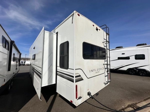 Any Grand Design Influence fifth wheel features five-sided aluminum cage construction with a walk-on roof and a fully enclosed underbelly with heated tanks and storage for all weather camping. For peace of mind, the MORryde CRE3000 Suspension system and ABS braking system will provide safe and smooth towing, and the 101" widebody construction offers all the room you need and that is before multiple slides are fully engaged. You will appreciate the keyed alike locks, slam-latch baggage doors with magnetic door catches, exterior security light, and solid surface entry steps. On the inside, Congoleum flooring, premium roller shades for privacy, a hallway handrail for safety, and nightstands with USB ports to keep all of your electronics fully charged. You will also love the On Demand tankless water heater when showering, plus the added heat and ambiance from an electric fireplace, and so much more!