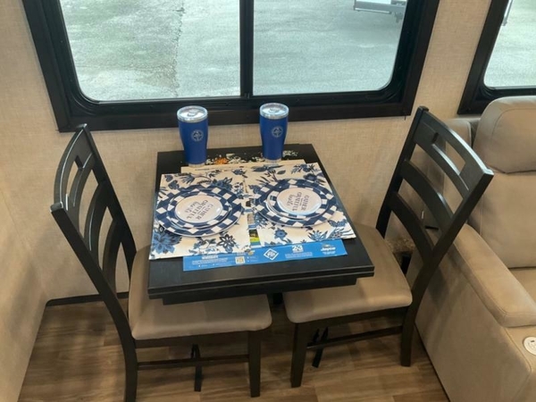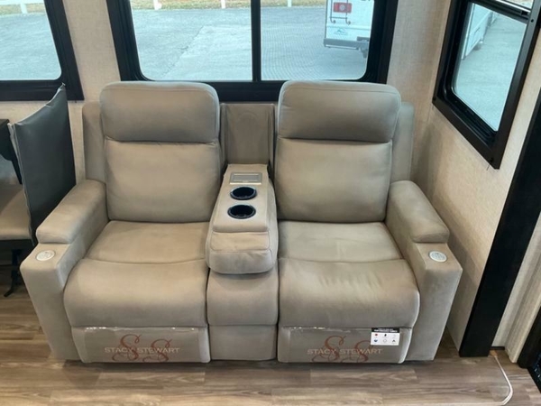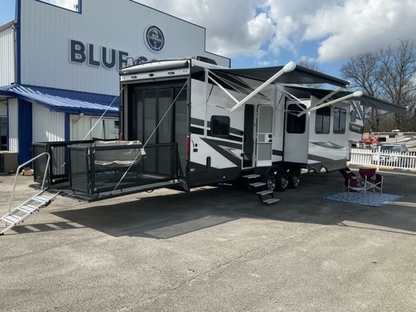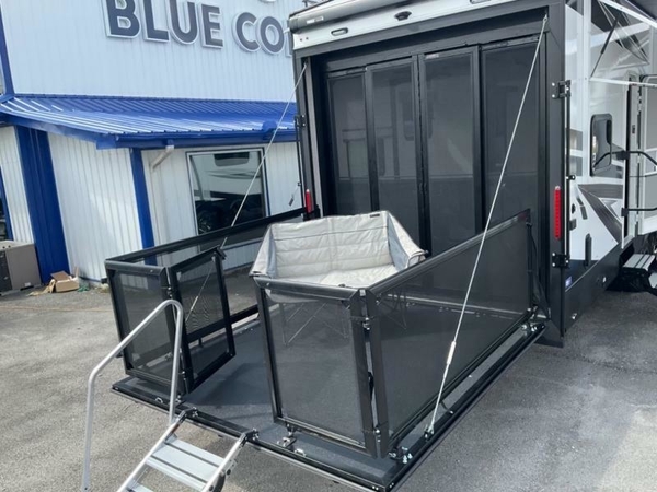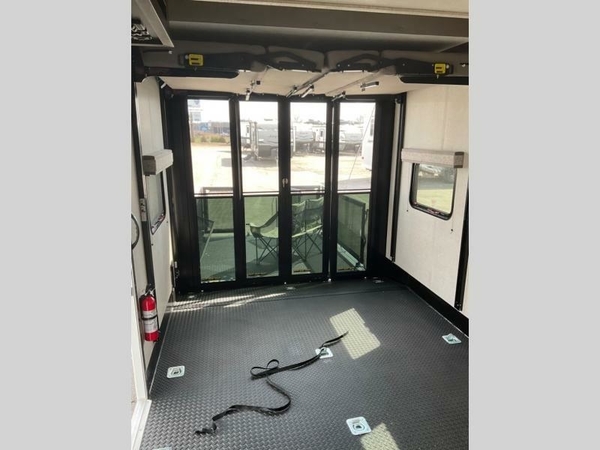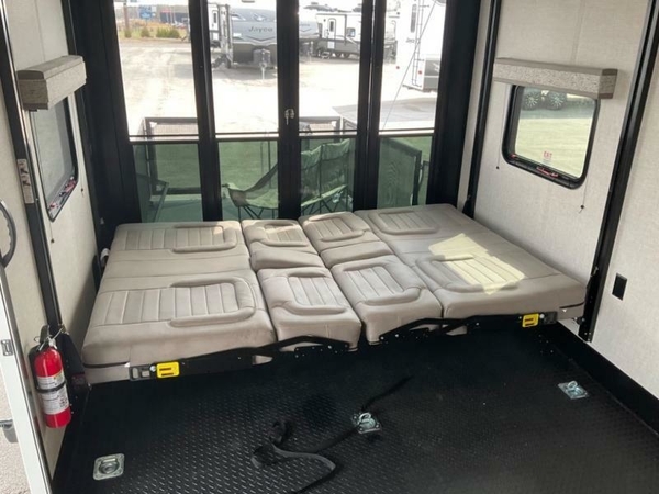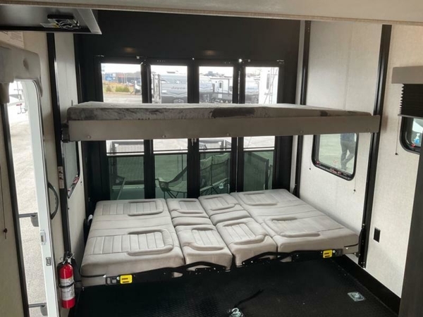 Take your outdoor adventures up a notch with this Seismic toy hauler. You can take the whole gang along for some fun with triple slides and dual entry for easy access going in and out. Your friends will sleep comfortably on the convertible sofas with overhead queen bed above in the 14' cargo garage space. There is also a storage space/loft above for their things and additional sleeping if needed. Inside, a full bath can be shared by all to get cleaned up each day, and all can gather inside in the spacious living area featuring dual opposing slides. Theater seating and an L-shaped tri-fold sofa creates plenty of space for lounging and there is also a dining table for four inside and the second table in the garage area also allows for more seating during meals inside when the weather isn't that nice. A side awning provides protection from the elements just outside the main door, plus the rear ramp party deck with steps and awning creates even more outdoor living space to enjoy!