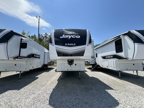 With any Eagle fifth wheel or travel trailer by Jayco you will appreciate durable construction materials, like the Magnum Truss Roof and the Stronghold VBL laminated walls. The JAYCOMMAND Smart RV system puts you in control of your RV's functions, and the 5 Star Handling Package will provide smooth towing from home to camp. Each model features Climate Shield zero-degree tested weather protection and the industry-exclusive HELIX cooling system that features two 15,000 BTU Whisper Quiet A/C's to keep you comfortable year around. Some of the exterior conveniences you are sure to love are the pass-through storage with Slam-Latch baggage doors and an automotive style front cap with max turn radius. The Eagle fifth wheels and travel trailers are designed to make you feel at home with solid hardwood slide fascia, residential vinyl flooring, a bathroom skylight, and plenty of storage for all your belongings.