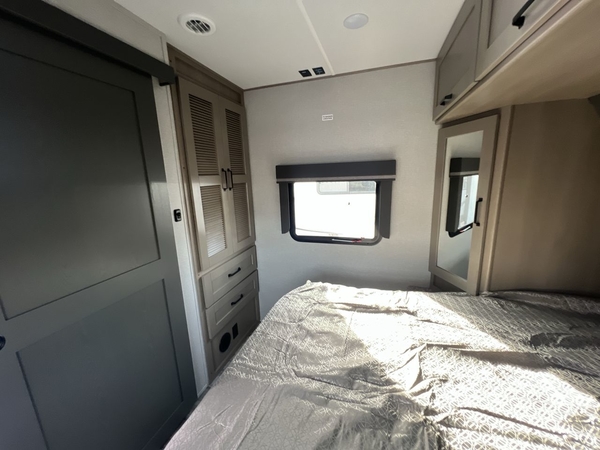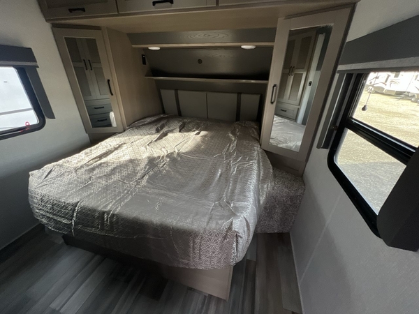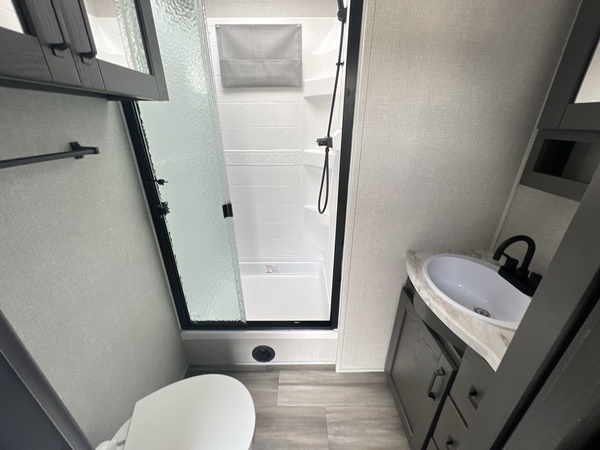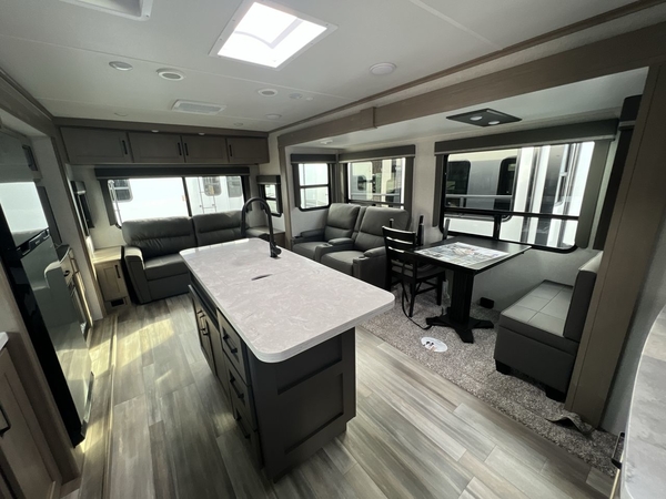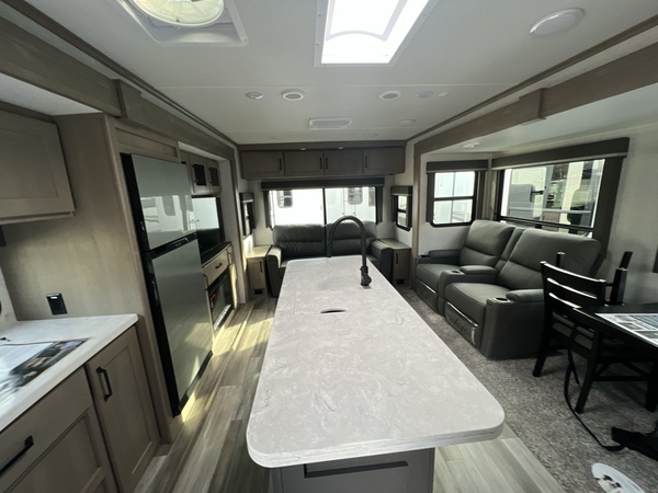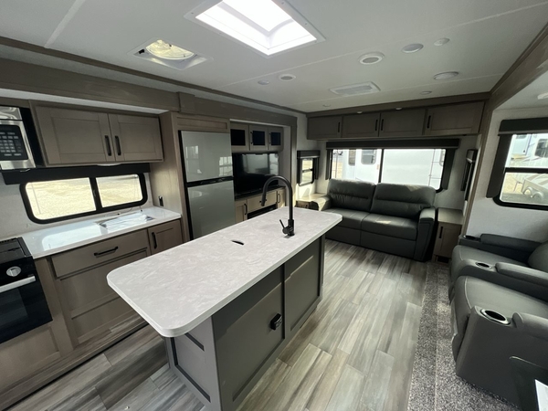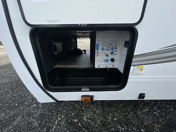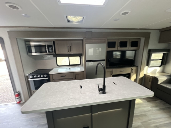 Whether you travel to explore or relax, this trailer will give you the choice depending where you park it! The outside kitchen provides another place to make meals when you want to be in the outdoors, and the inside kitchen amenities offer a gourmet kitchen including a 10 cu. ft. refrigerator, an island, and a hutch. You and your guests will find theater seating with cupholders, a booth dinette or choose a free standing dinette option, and a tri-fold sofa to sit on and visit while you watch the 40" LED HDTV with fireplace below. The full bathroom includes a space saving sliding door and linen storage, and the bedroom gives you a front walk-around queen bed with storage for your clothes on each side, plus there is an additional wardrobe with drawers and the option to add a washer/dryer to the prepped space.