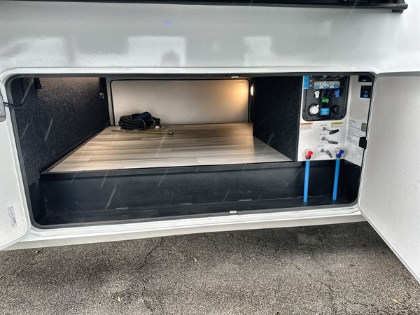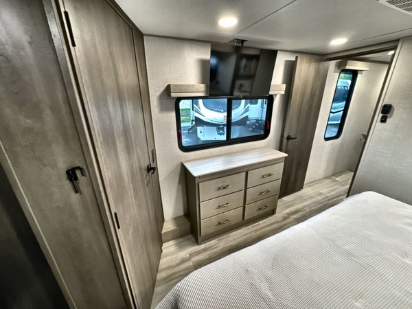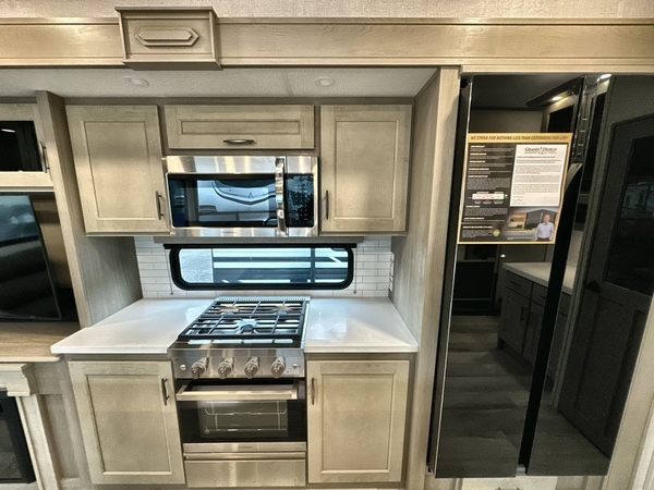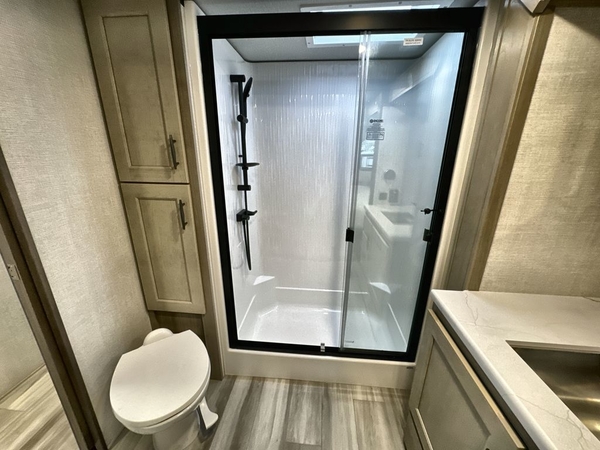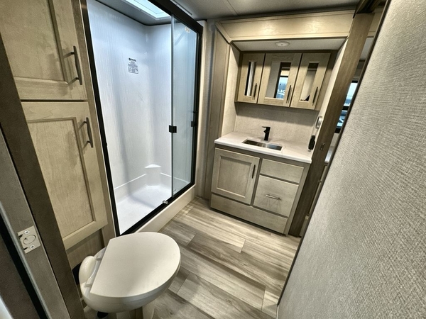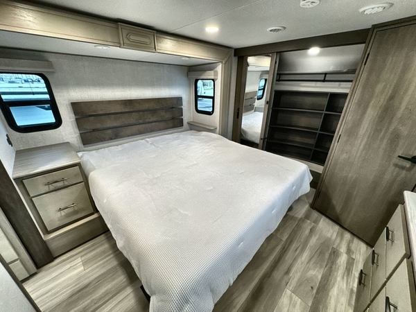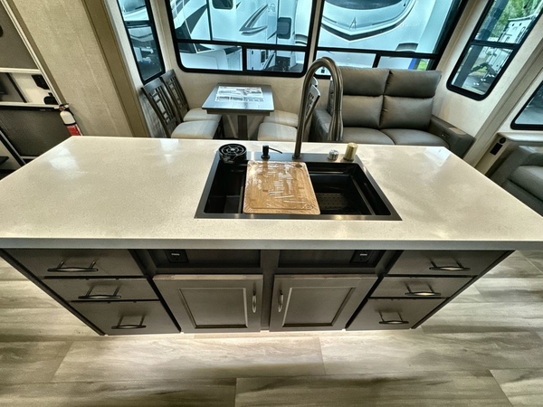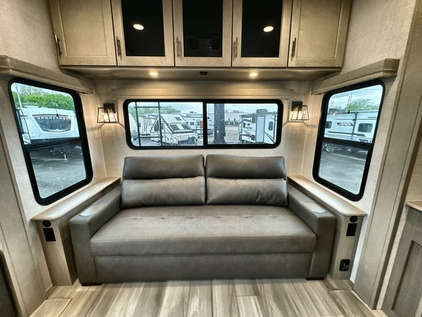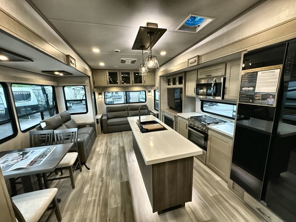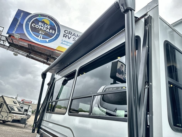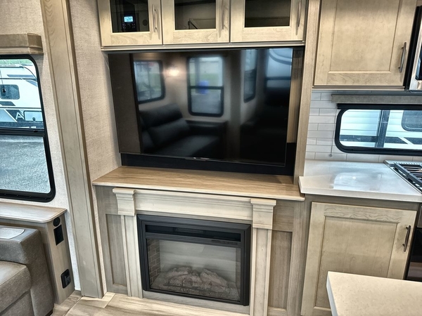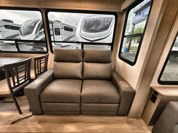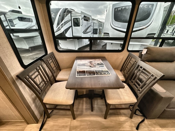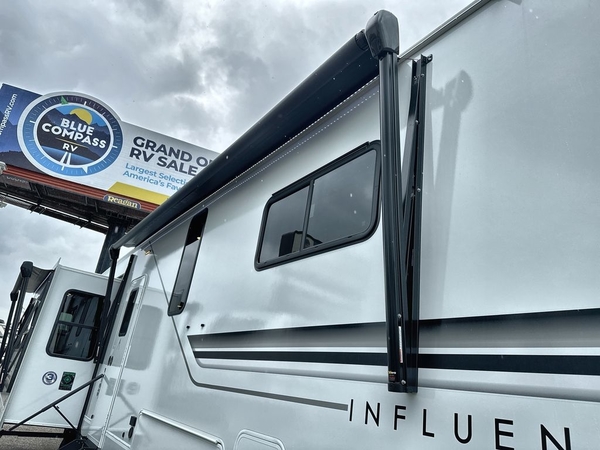 Any Grand Design Influence fifth wheel features five-sided aluminum cage construction with a walk-on roof and a fully enclosed underbelly with heated tanks and storage for all weather camping. For peace of mind, the MORryde CRE3000 Suspension system and ABS braking system will provide safe and smooth towing, and the 101" widebody construction offers all the room you need and that is before multiple slides are fully engaged. You will appreciate the keyed alike locks, slam-latch baggage doors with magnetic door catches, exterior security light, and solid surface entry steps. On the inside, Congoleum flooring, premium roller shades for privacy, a hallway handrail for safety, and nightstands with USB ports to keep all of your electronics fully charged. You will also love the On Demand tankless water heater when showering, plus the added heat and ambiance from an electric fireplace, and so much more!