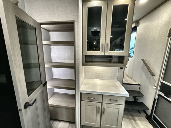 A perfect couples coach featuring triple slides and a tri-fold sofa just in case you want to have overnight guests! You will love the spacious interior thanks to the dual opposing slides in the main living and kitchen area. Here you will find a kitchen island in the center and plenty of seating with a free standing dinette, theater seating for movie night opposite the fireplace and entertainment center, as well as a tri-fold sofa. The kitchen offers all of the amenities just like home, a 16 cu. ft. 12-volt refrigerator for your perishables, and a pantry and hutch nearby for dry goods and dishes. There is even a pet dish under the refrigerator for your furry friends. The center island offers added counter space and a sink for dishes and prep work. Head up the steps to your private front bedroom with queen bed slide, and bathroom with dual entry. You even have washer/dryer prep in case you wish to add the units and enjoy even more at-home conveniences!