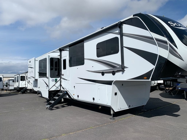 Each Solitude fifth wheel by Grand Design features a 101" wide-body construction, heavy duty 7,000 lb. axles, frameless tinted windows, and high-gloss gel coat sidewalls. You can camp year around thanks to the Weather-Tek Package that includes a 35K BTU high-capacity furnace, an all-in-one enclosed and heated utility center, and a fully enclosed underbelly with heated tanks and storage. Inside, you'll love the premium roller shades, hardwood cabinet doors, solid surface countertops and sinks, plus residential finishes throughout to make you truly feel at home. Each model also includes a MORryde CRE3000 suspension system, self adjusting brakes, and a MORryde pin box that will provide smooth towing from home to campground. Affordable luxury is possible with the Solitude fifth wheels; choose yours today!