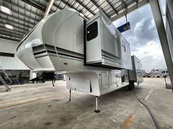 Any Grand Design Influence fifth wheel features five-sided aluminum cage construction with a walk-on roof and a fully enclosed underbelly with heated tanks and storage for all weather camping. For peace of mind, the MORryde CRE3000 Suspension system and ABS braking system will provide safe and smooth towing, and the 101" widebody construction offers all the room you need and that is before multiple slides are fully engaged. You will appreciate the keyed alike locks, slam-latch baggage doors with magnetic door catches, exterior security light, and solid surface entry steps. On the inside, Congoleum flooring, premium roller shades for privacy, a hallway handrail for safety, and nightstands with USB ports to keep all of your electronics fully charged. You will also love the On Demand tankless water heater when showering, plus the added heat and ambiance from an electric fireplace, and so much more!