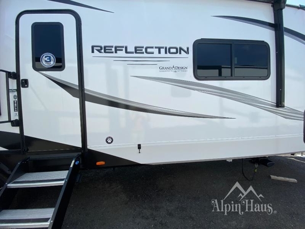 With any Reflection travel trailer by Grand Design, you will have a solar panel for off-grid camping and a 50 amp charge controller and inverter prep, a Universal All-In-One docking station, unobstructed pass-through storage, and nitrogen filled radial tires. Some other top features include the 30" stainless steel microwave, the maximum 7-foot headroom, and the ductless heating system with no vents in the floor to collect debris. Each is constructed of gel coat exterior sidewalls, residential 5" truss rafters, walk-on roof decking, a fiberglass and radiant foil roof and front cap insulation plus laminated aluminum framed side walls, roof and end walls in slide rooms. Choose luxury, value, and towability over all the others, take home a Reflection of your good taste!