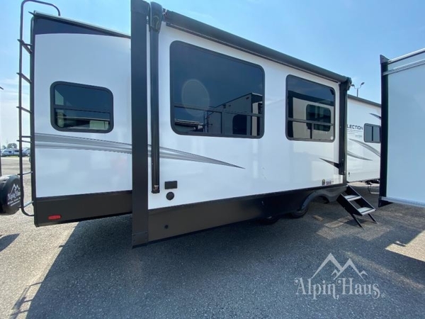 The chef of the group will love the gourmet kitchen including the 16 cu. ft. refrigerator that will hold lots of cold ingredients, beverages and leftovers, the center island when preparing and serving meals, and the hutch with overhead cabinets to display and store dishes and such. This area also includes two slide outs for more floor space and furniture to relax on including theatre seating with cupholders for your drinks, a booth dinette to dine at and work from or choose a free standing dinette option, and a rear tri-fold sofa that offers sleeping space for two at night. There is a 40" LED HDTV with fireplace below to enjoy while inside, plus there are two awnings outdoors to relax under. When you are ready to call it a night, get cleaned up in the full bathroom, and retire to your front bedroom with a slide out queen bed or choose a king option, a front full-wall wardrobe with washer/dryer prep, a dresser and an additional wardrobe with drawers.