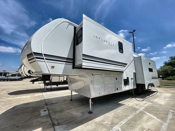 Any Grand Design Influence fifth wheel features five-sided aluminum cage construction with a walk-on roof and a fully enclosed underbelly with heated tanks and storage for all weather camping. For peace of mind, the MORryde CRE3000 Suspension system and ABS braking system will provide safe and smooth towing, and the 101" widebody construction offers all the room you need and that is before multiple slides are fully engaged. You will appreciate the keyed alike locks, slam-latch baggage doors with magnetic door catches, exterior security light, and solid surface entry steps. On the inside, Congoleum flooring, premium roller shades for privacy, a hallway handrail for safety, and nightstands with USB ports to keep all of your electronics fully charged. You will also love the On Demand tankless water heater when showering, plus the added heat and ambiance from an electric fireplace, and so much more!