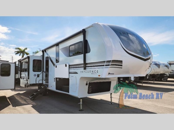 Any Grand Design Influence fifth wheel features five-sided aluminum cage construction with a walk-on roof and a fully enclosed underbelly with heated tanks and storage for all weather camping. For peace of mind, the MORryde CRE3000 Suspension system and ABS braking system will provide safe and smooth towing, and the 101" widebody construction offers all the room you need and that is before multiple slides are fully engaged. You will appreciate the keyed alike locks, slam-latch baggage doors with magnetic door catches, exterior security light, and solid surface entry steps. On the inside, Congoleum flooring, premium roller shades for privacy, a hallway handrail for safety, and nightstands with USB ports to keep all of your electronics fully charged. You will also love the On Demand tankless water heater when showering, plus the added heat and ambiance from an electric fireplace, and so much more!