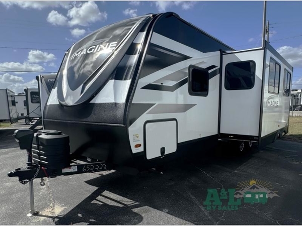 Where will you go with this Imagine travel trailer? The possibilities are endless! You can take your family on an exciting excursion because this trailer has enough sleeping space for everyone with a 60" x 80" queen bed in the private bedroom, a U-shaped dinette and tri-fold sofa in the main living area, and there is a set of 47" x 76" bunk beds with privacy curtains in the rear corner. You can come and go as you please with two entry doors, and the outdoor griddle and refrigerator will be fun to use when the weather is nice. The flip-up countertop extension will make it easier to prepare delicious home cooked meals and the shoe storage area helps to keep things neat and tidy.