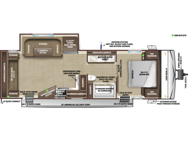 Combining residential construction practices such as 16" on-center structural framing, cut & glued batten insulation, 5/8" thick tongue & groove floor decking with pocket-screwed, mortise & tenon cabinet construction with 75 lb. ball bearing drawer guides and hardwood cabinet doors to ensure durability and elegance. Pressed membrane kitchen countertops, a three-burner cooktop with a high output front burner, a double rack oven and microwave provide a sleek and easy-to-clean space for food prep while the range hood effectively removes smoke and odors from the kitchen. A residential high-rise faucet, single basin under-mount sink, 11cu/ft dual swing door 12V refrigerator, and residential vinyl flooring, with the flush floor slide, ensures practicality, making clean-up a breeze.