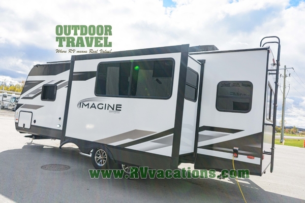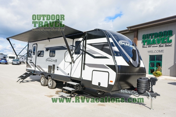 You will have an amazing amount of fun in this Imagine travel trailer! There is a tri-fold sofa and U-shaped dinette with removable ottoman that you can relax on while you watch the LED HDTV, and this trailer has two entry doors so that you can come and go as you please. The private bedroom contains the second entry door, so you can quickly head inside to grab a sweatshirt when you need one. While you're outside, you'll have a 21' power awning to protect you, and there is an exterior coax TV hookup, LP quick connect, and spray port to make your camping life easier. The interior walk-through bathroom connects the bedroom to the rest of the trailer, and the kitchen has a countertop extension so that you can chop veggies on extra counter space.