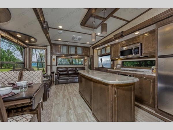 If you are on the search for a livable fifth wheel for those month long trips this Solitude might be the one! Just imagine cooking on a professional grade stainless steel cooktop and inside a built-in oven or convection microwave. The cook can prepare the meals on the kitchen island, and store leftovers in the stainless steel 18 cu. ft. four door refrigerator. When you and your spouse aren't outside, the big screen LED TV in the living area can keep you entertained while staying warm by the fireplace. There is plenty of storage throughout including for your shoes, dry goods, linens, and your wardrobe. You might even like to choose a few options such as adding a washer and dryer, a dishwasher, a king size bed, or even a pull-out kitchen outside. Come see how this Solitude will make life comfortable for years to come!